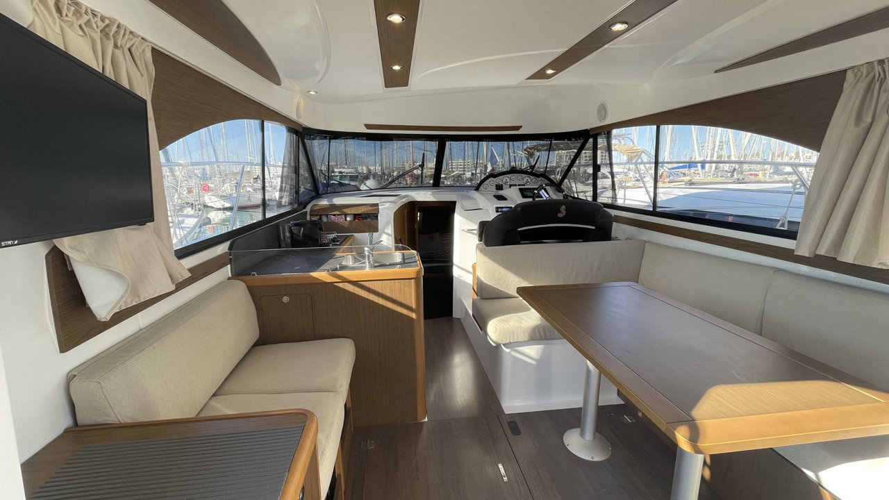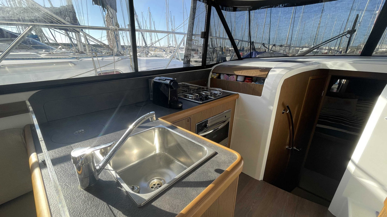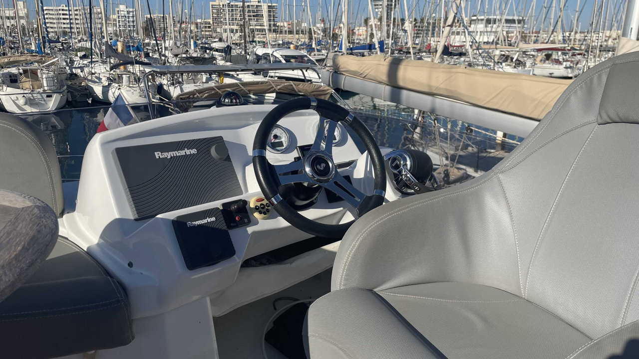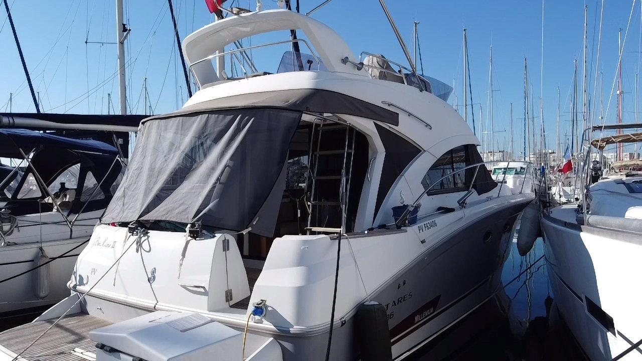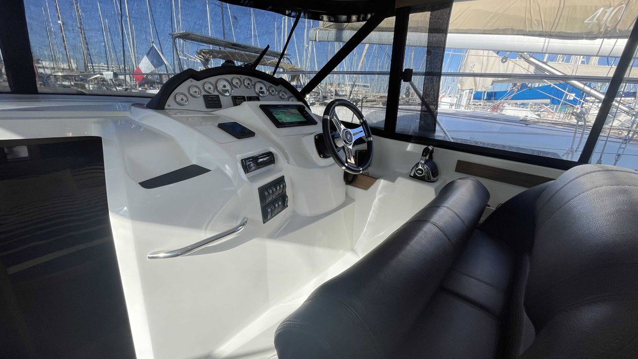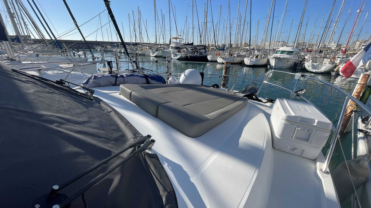 L’Antares 36 mise sur le plaisir en navigation et au mouillage et dispose d’un flybridge généreux offrant un second poste de conduite, un véritable salon et un bain de soleil. Les aménagements intérieurs sont pensés pour être conviviaux et très fonctionnels, pour profiter d’un programme de croisière en famille en toute sécurité. Sa coque évasée fend confortablement tous les types de mer avec une stabilité remarquable.Marque Beneteau