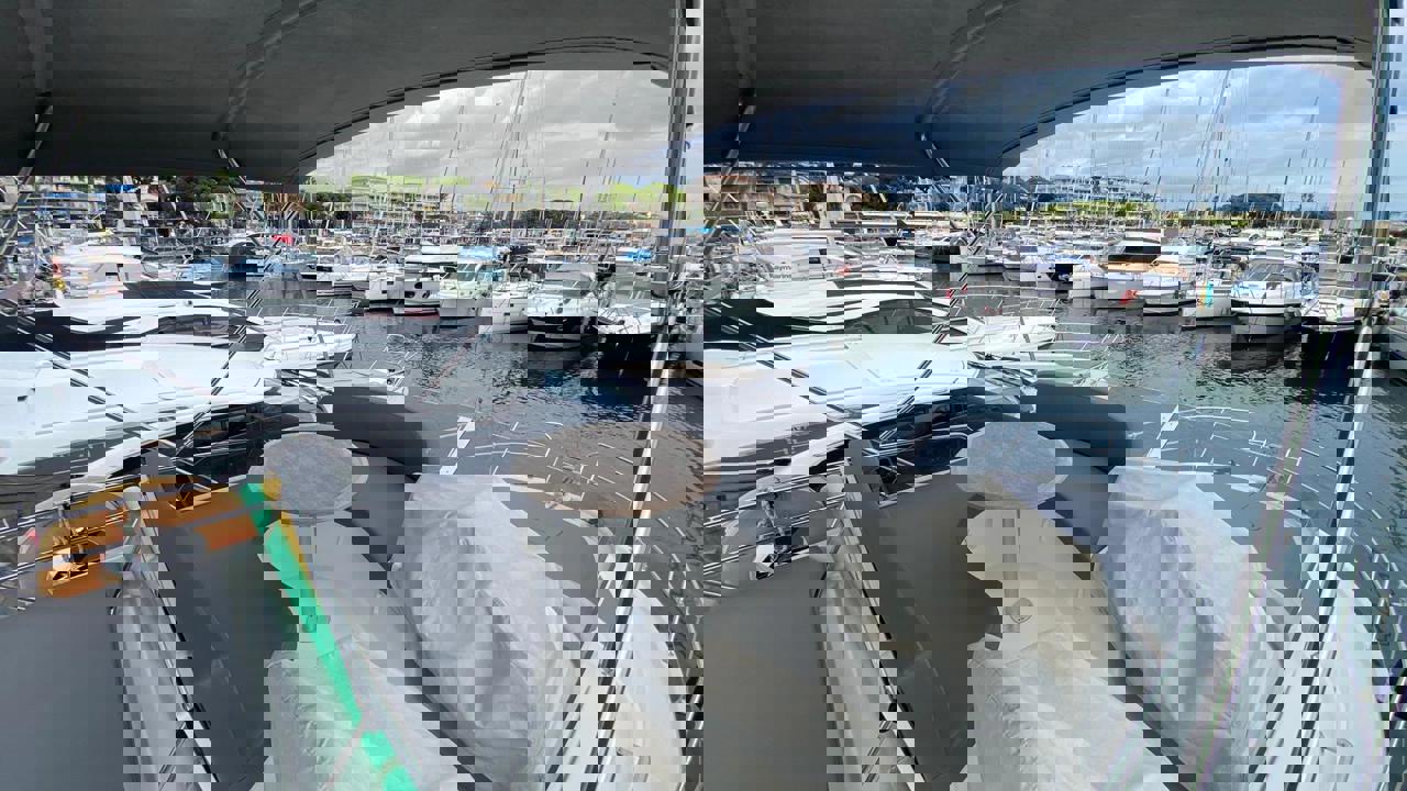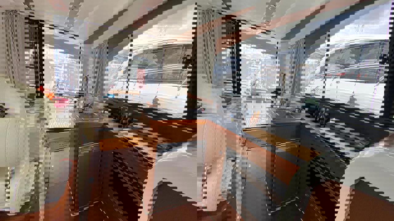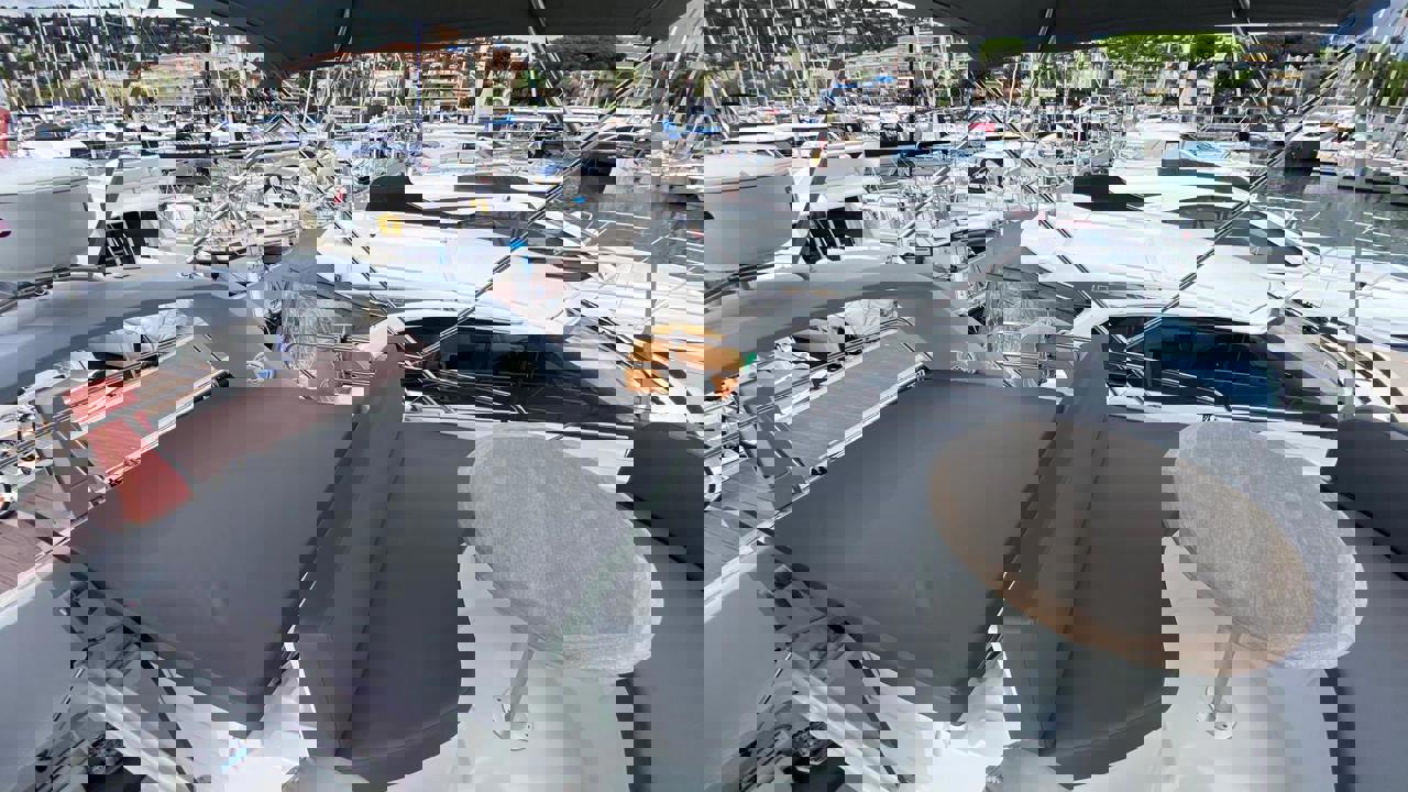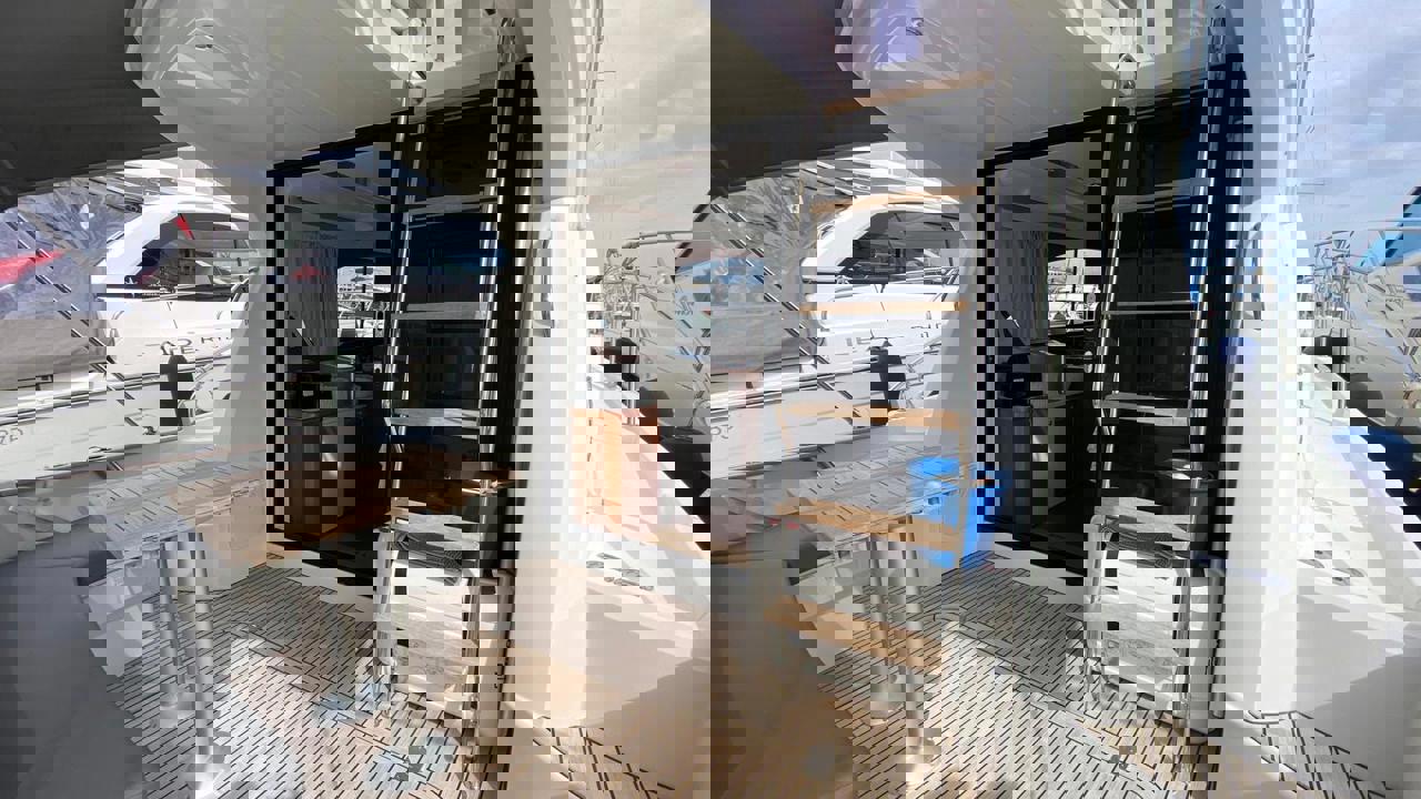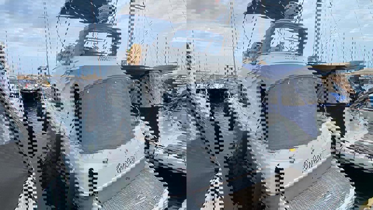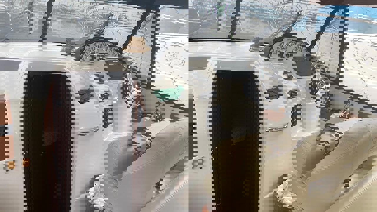 fly bridgepont teckpropulseur d'étravebiminitaud fermeture arrièretaud de flyplateforme de bainéchelle de bainbain de soleil avantbain de soleil arrièrecockpit teckdouchette cockpittable cockpitcoussin cockpitéclairage cockpitancreguindeau électriquecapacité eau chaudecapacité eau froidepompe de calecouleurmatérieau constructionantifoulingheures bateauannexemoteur annexeréfrigérateurcuisinièrefourclimatisationchauffe-eauradio-cdhi-fidéssalinisaateurWC électriquepilote autocentrale de navigationcompasantenneVHFGPStraceursondeurrépetiteurchargeuralternateurgroupe électrogènebatteriesbatteries de servicecircuit 220Vcircuit 12Vprise de quai