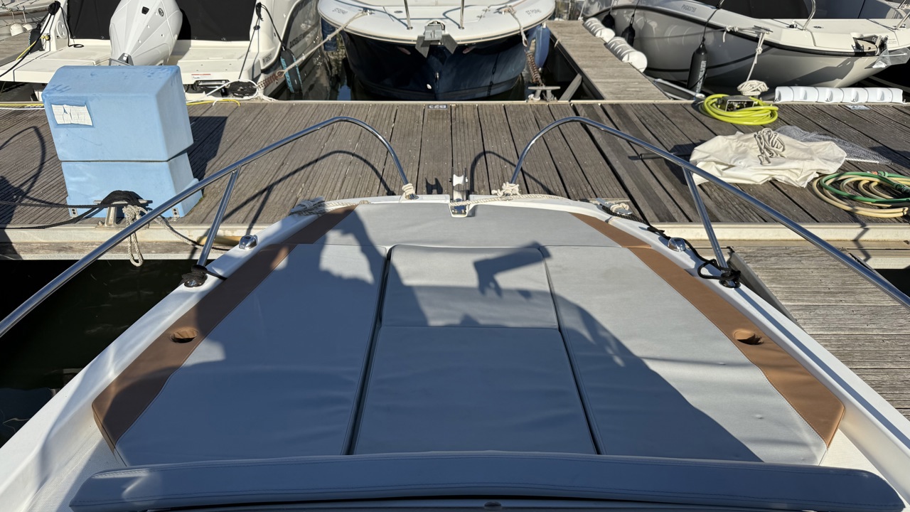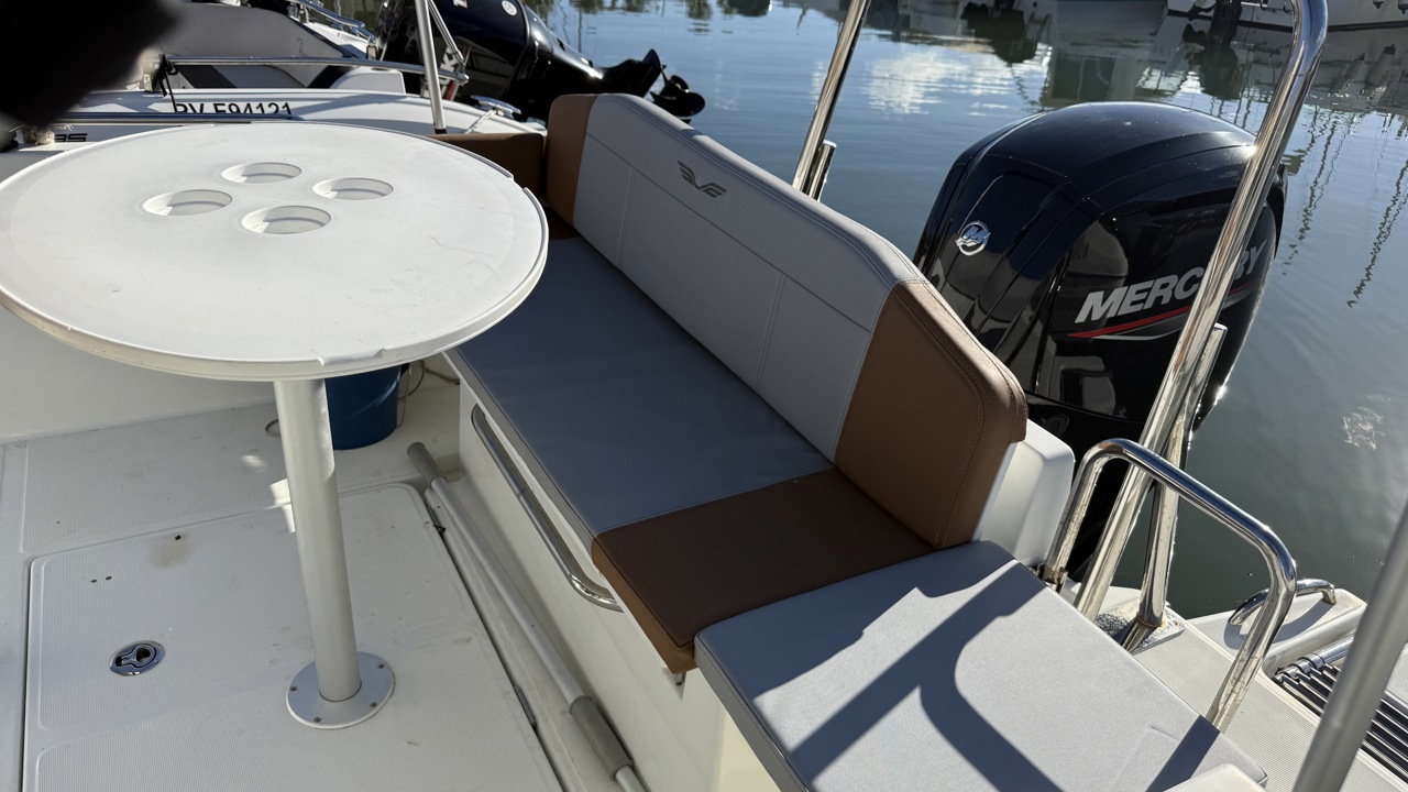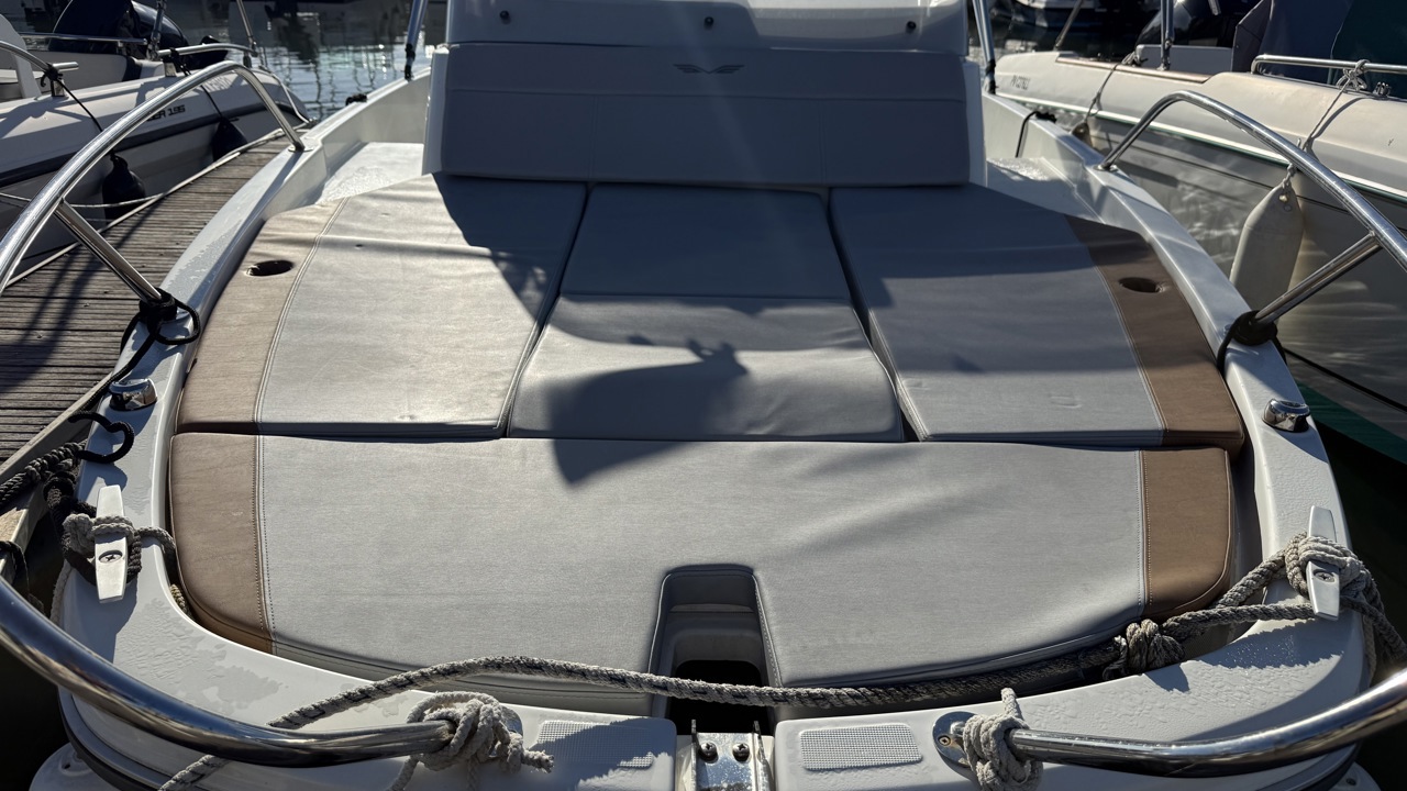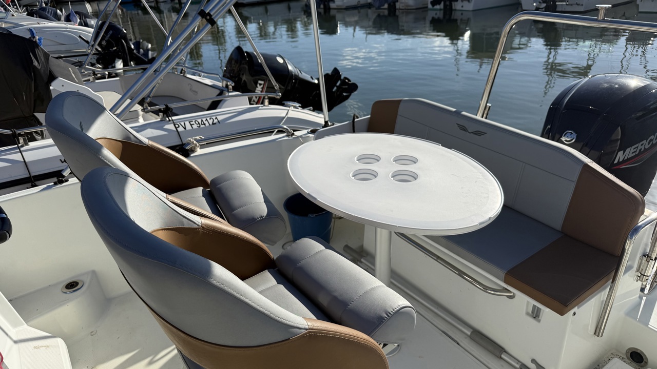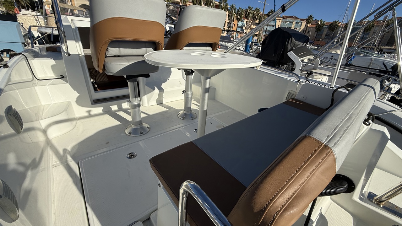 La cabine avant offre un espace de rangement pratique ou un couchage d’appoint pour vos escales. Grâce à son plan de pont ergonomique, l’accès à bord est simple et sécurisé. La motorisation Mercury 115 CV assure une navigation souple et agréable, avec une consommation maîtrisée et une maintenance simple Place de port possible Entretien moteur et carénage réalisée lors de la vente!