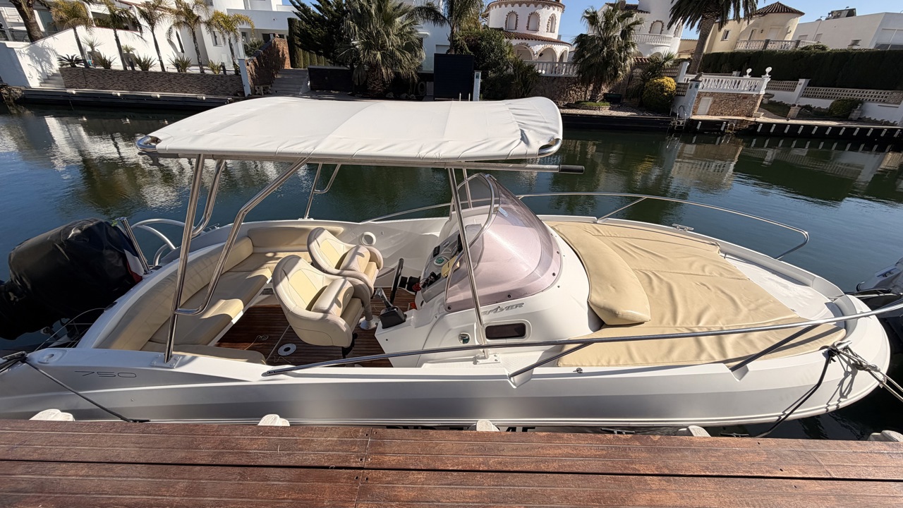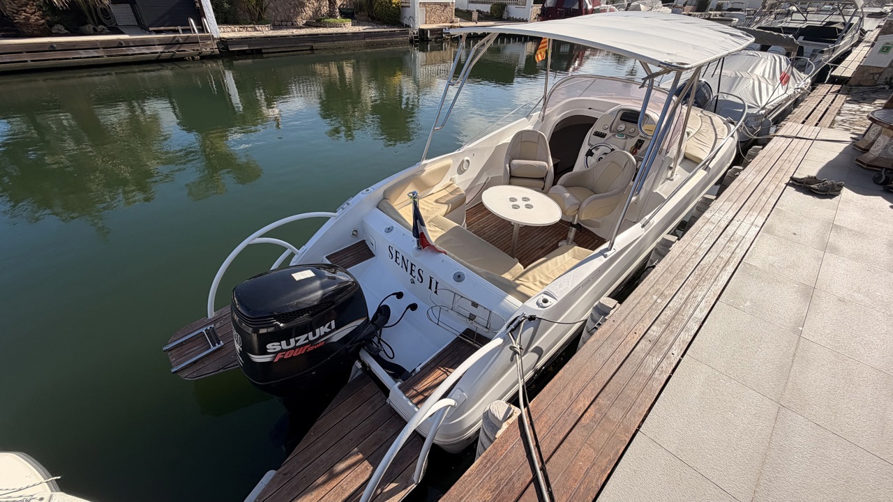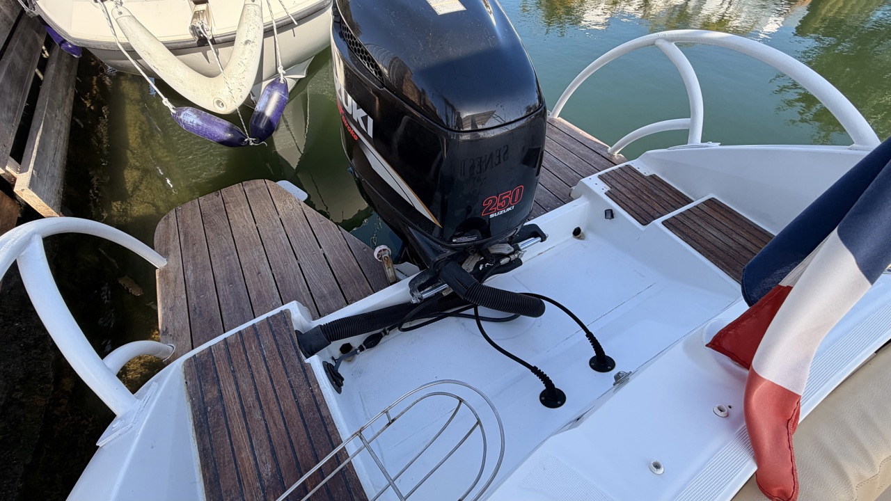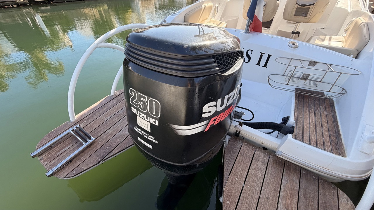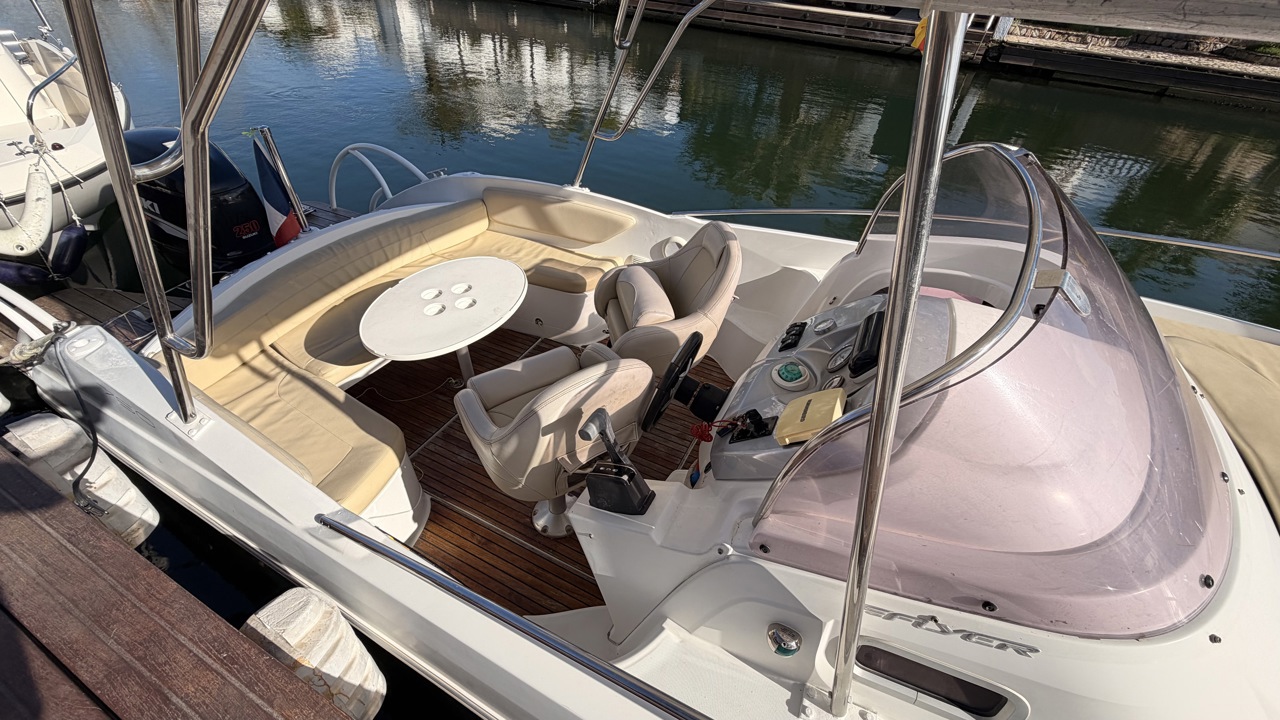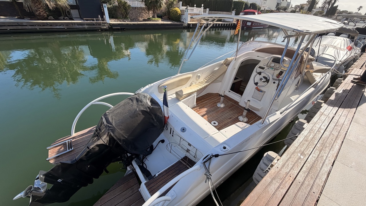 Magnifique Bénéteau Flyer 750 Sun Deck de 2008, en très bon état général, prêt à naviguer. Motorisé par un Suzuki DF250 de 250 ch affichant environ 950 h, avec un entretien complet réalisé chaque année avec factures. Bateau fiable, polyvalent et agréable en navigation. Belle configuration confort : cabine, WC, bain de soleil avant, bâche de cockpit, hard top inox, douchette arrière. Équipements appréciables : guindeau électrique, réfrigérateur, plateforme arrière inox, plancher teck entretenu, sellerie récente coloris beige, batteries changées récemment. Unité habitable et polyvalente, idéale pour les sorties à la journée comme pour les petites escapades côtières. BÉNÉTEAU FLYER 750 SUN DECK – 2008 – Suzuki 250 CV – Remorque possible en supplément – Visible à EmpuriabravaMarque Beneteau