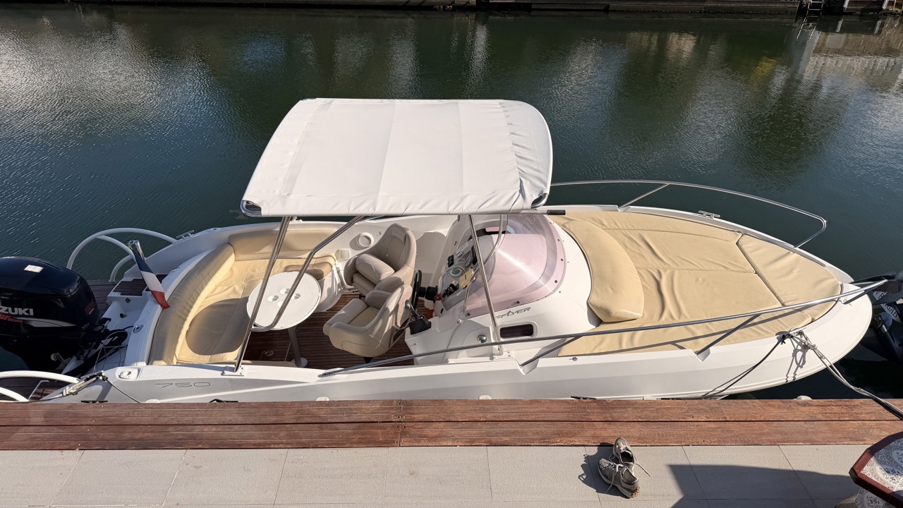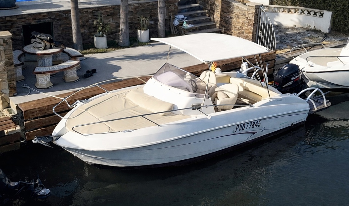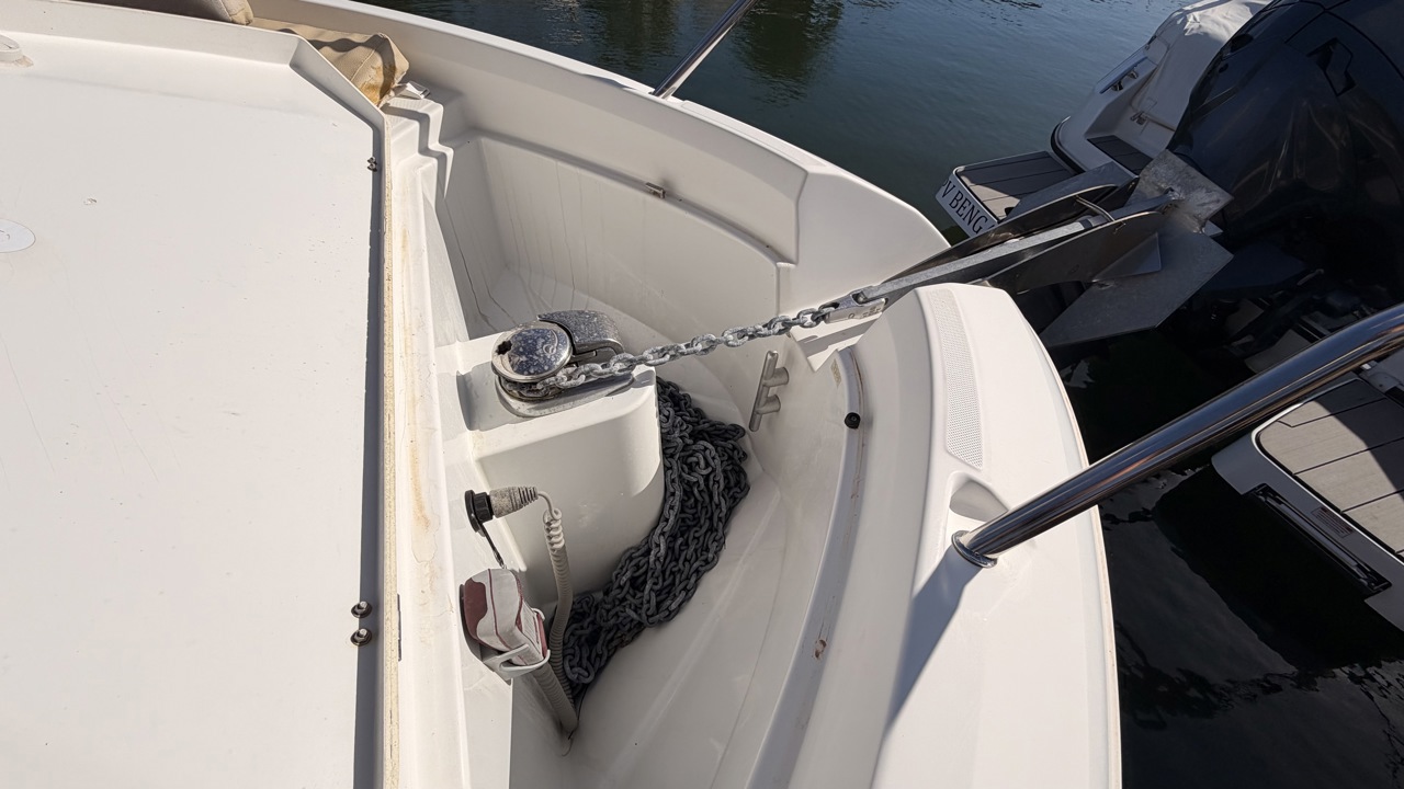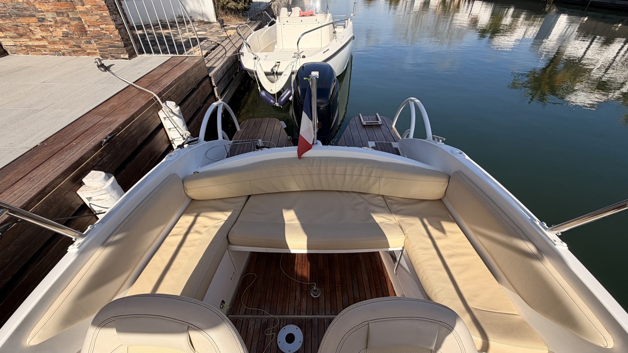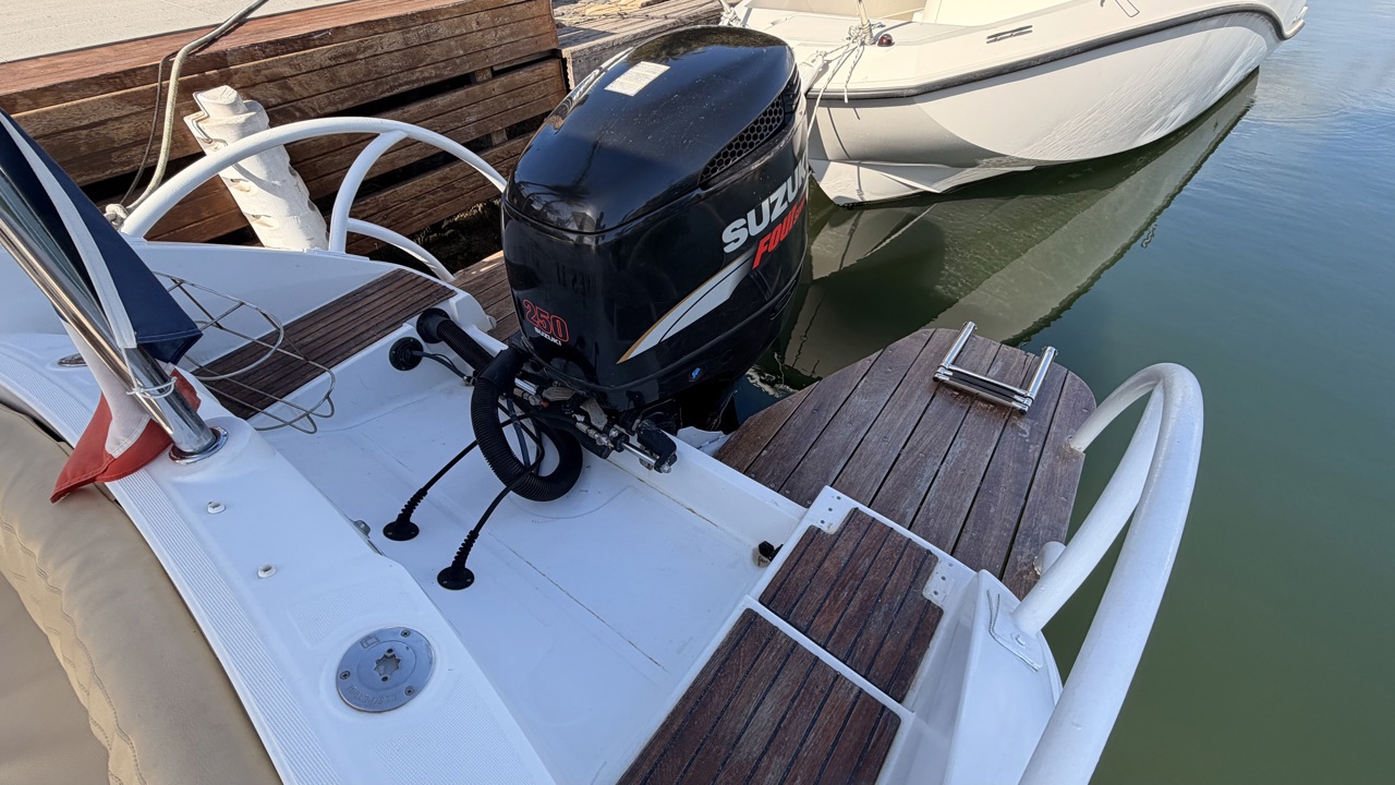 Magnifique Bénéteau Flyer 750 Sun Deck de 2008, en très bon état général, prêt à naviguer. Motorisé par un Suzuki DF250 de 250 ch affichant environ 950 h, avec un entretien complet réalisé chaque année avec factures. Bateau fiable, polyvalent et agréable en navigation. Belle configuration confort : cabine, WC, bain de soleil avant, bâche de cockpit, hard top inox, douchette arrière. Équipements appréciables : guindeau électrique, réfrigérateur, plateforme arrière inox, plancher teck entretenu, sellerie récente coloris beige, batteries changées récemment. Unité habitable et polyvalente, idéale pour les sorties à la journée comme pour les petites escapades côtières. BÉNÉTEAU FLYER 750 SUN DECK – 2008 – Suzuki 250 CV – Remorque possible en supplément – Visible à EmpuriabravaMarque Beneteau
