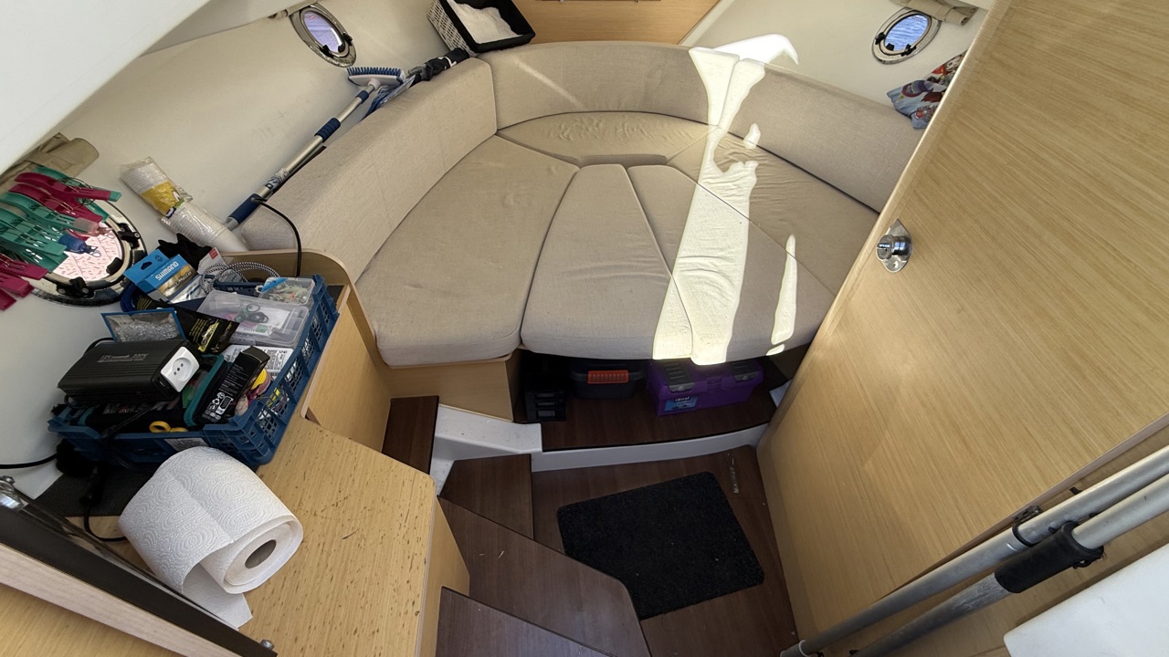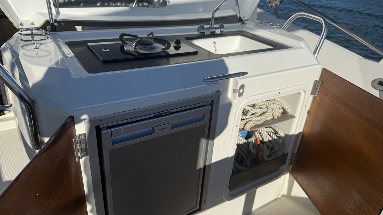 pompe de caleeau chaudeeau froidecoussin cockpitdouchette cockpittable cockpitbatteriesbatteries de servicecircuit 220Vcirduit 12Vprise de quaicompasgpssondeurbain de soleil avantbiminiéchelle bainflapsplateforme bainréchaudréfrigerateurcarré transformablechauffe eauhi-fimicro ondeswc marinsguindeau électriqueporte canneMat de ski