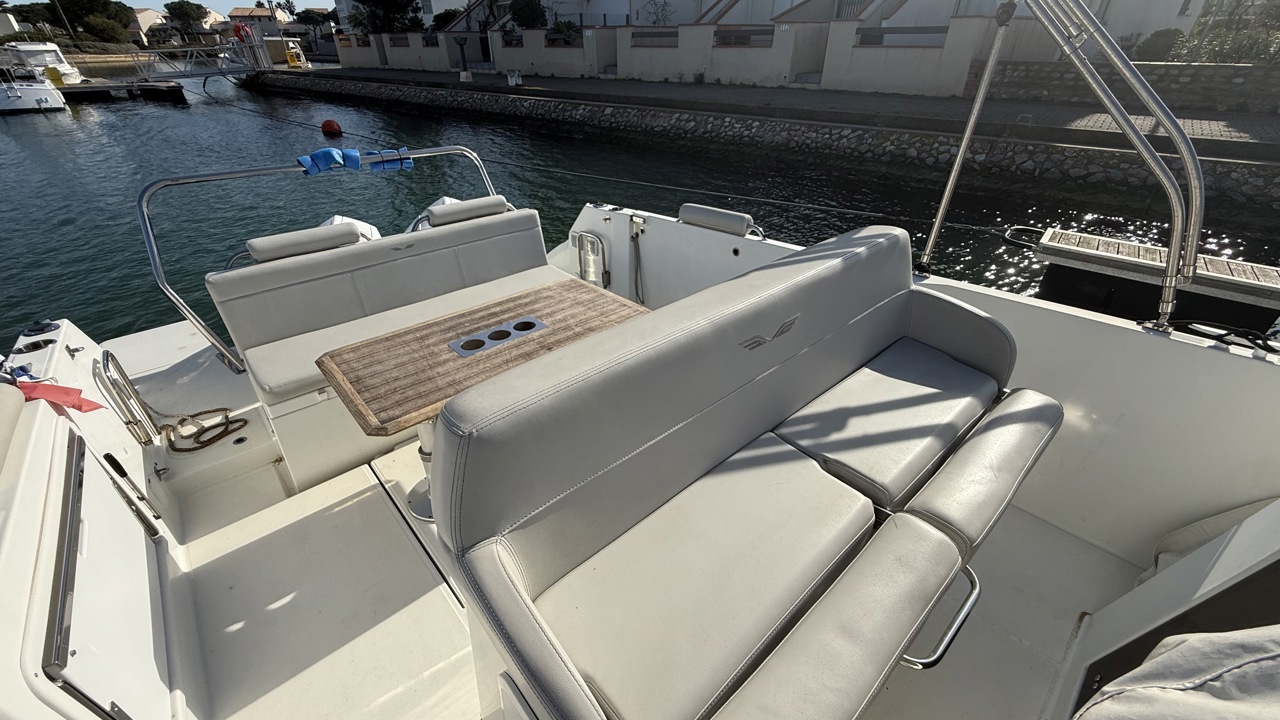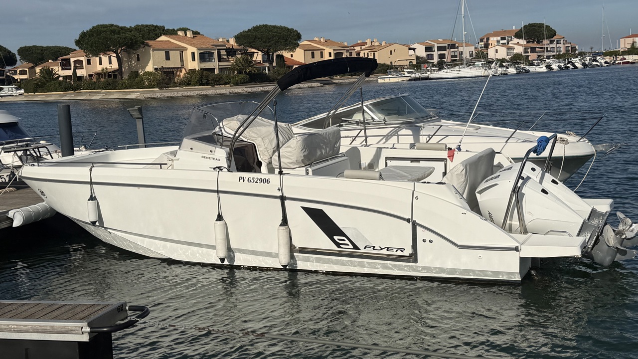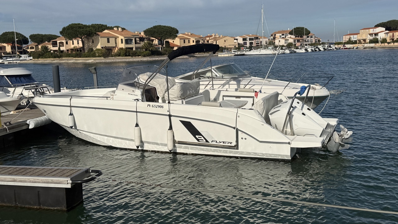 Bateau d’exception – Disponible immédiatement Esprit Bateau vous propose en exclusivité ce superbe Bénéteau Flyer 9 Spacedeck de 2021, dans une configuration très recherchée, équipé de 2 x 225 CV Mercury blancs et affichant seulement 140 heures de navigation. Un bateau soigneusement entretenu chaque année, avec un suivi rigoureux, dans un état irréprochable, prêt à naviguer immédiatement pour la saison. ⚙️ Motorisation puissante & fiable Double motorisation 2 x 225 CV Mercury Seulement 140 heures moteur Entretien annuel professionnel Performances remarquables et excellente tenue en mer Cette configuration garantit puissance, confort de navigation et sécurité, que ce soit pour les sorties sportives ou familiales. ???? Équipements électroniques complets GPS / Sondeur Garmin VHF Navicom avec AIS Flaps Commandes électroniques Un équipement moderne assurant précision, contrôle et sérénité en navigation. ☀️ Confort & aménagements premium Grand bain de soleil avant Bain de soleil arrière Table de cockpit conviviale Cabine avec couchage Assises latérales confortables Porte latérale ouvrante avec descente à l’eau Réfrigérateur Mât de ski nautique Porte-cannes Taud de Bimini Le Flyer 9 Spacedeck est reconnu pour sa polyvalence : idéal pour les sorties en famille, le farniente, les sports nautiques ou la pêche. ????️ Protections & sécurité Housses de protection bains de soleil Housses de protection poste de pilotage et assises Armement de sécurité complet Pourquoi acheter chez Esprit Bateau ? ✔ Bateau en exclusivité ✔ Sélection rigoureuse ✔ Accompagnement personnalisé ✔ Dossier complet sur demande ✔ Disponibilité immédiate ???? Visible sur rendez-vous ???? Disponible pour la saison ???? Photos supplémentaires et dossier complet sur demande Contactez Esprit Bateau dès maintenant Ne manquez pas cette opportunité d’acquérir un Flyer 9 Spacedeck 2021 en état exceptionnel, dans une configuration très recherchée sur le marché de l’occasion.Marque Beneteau