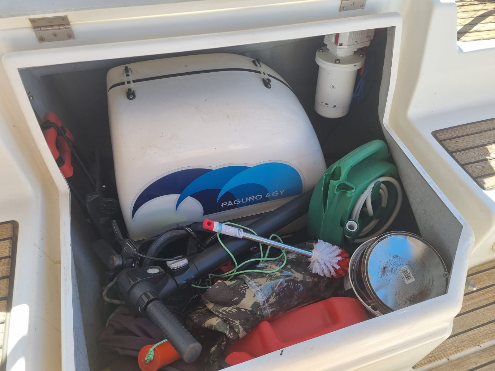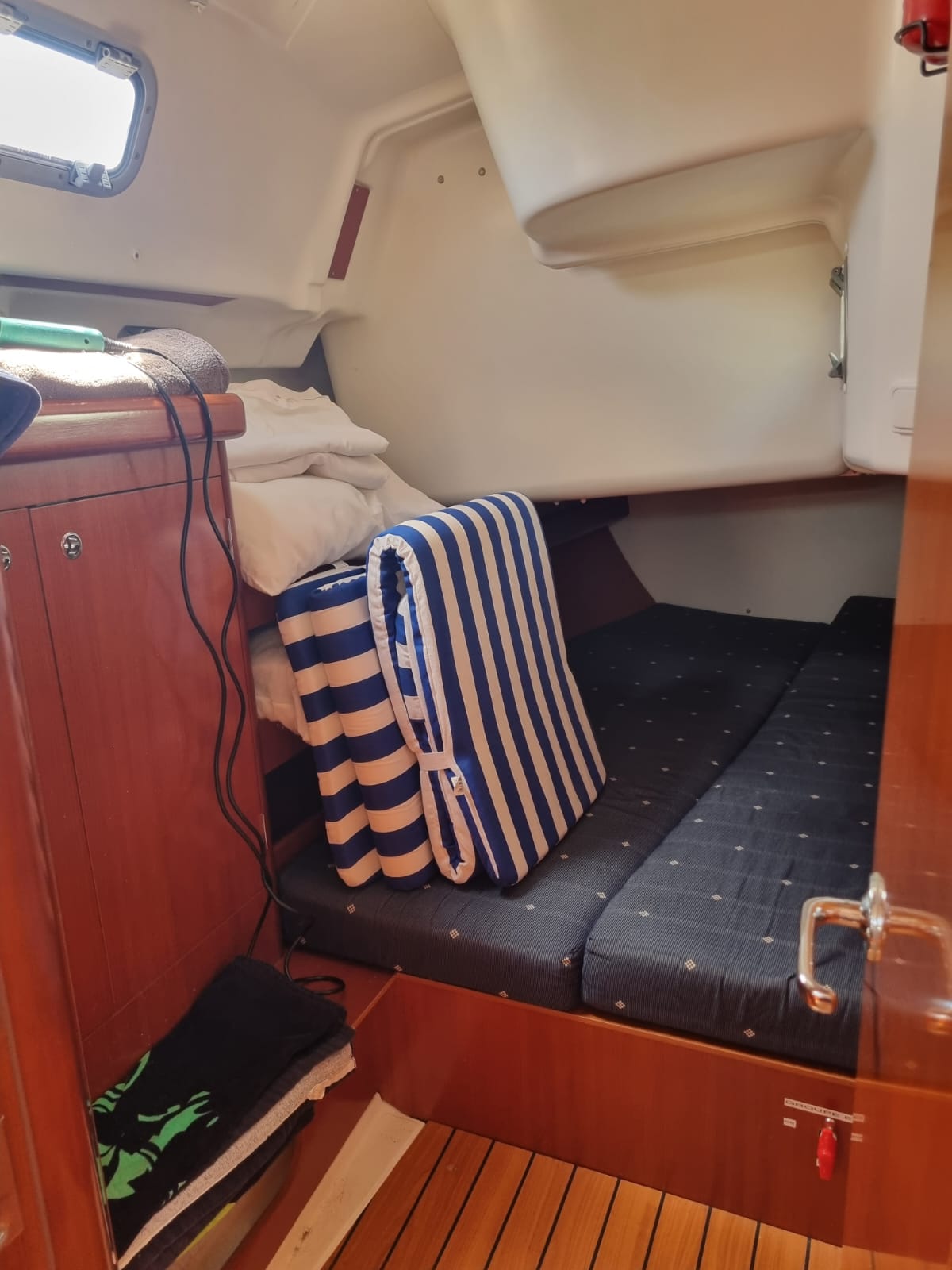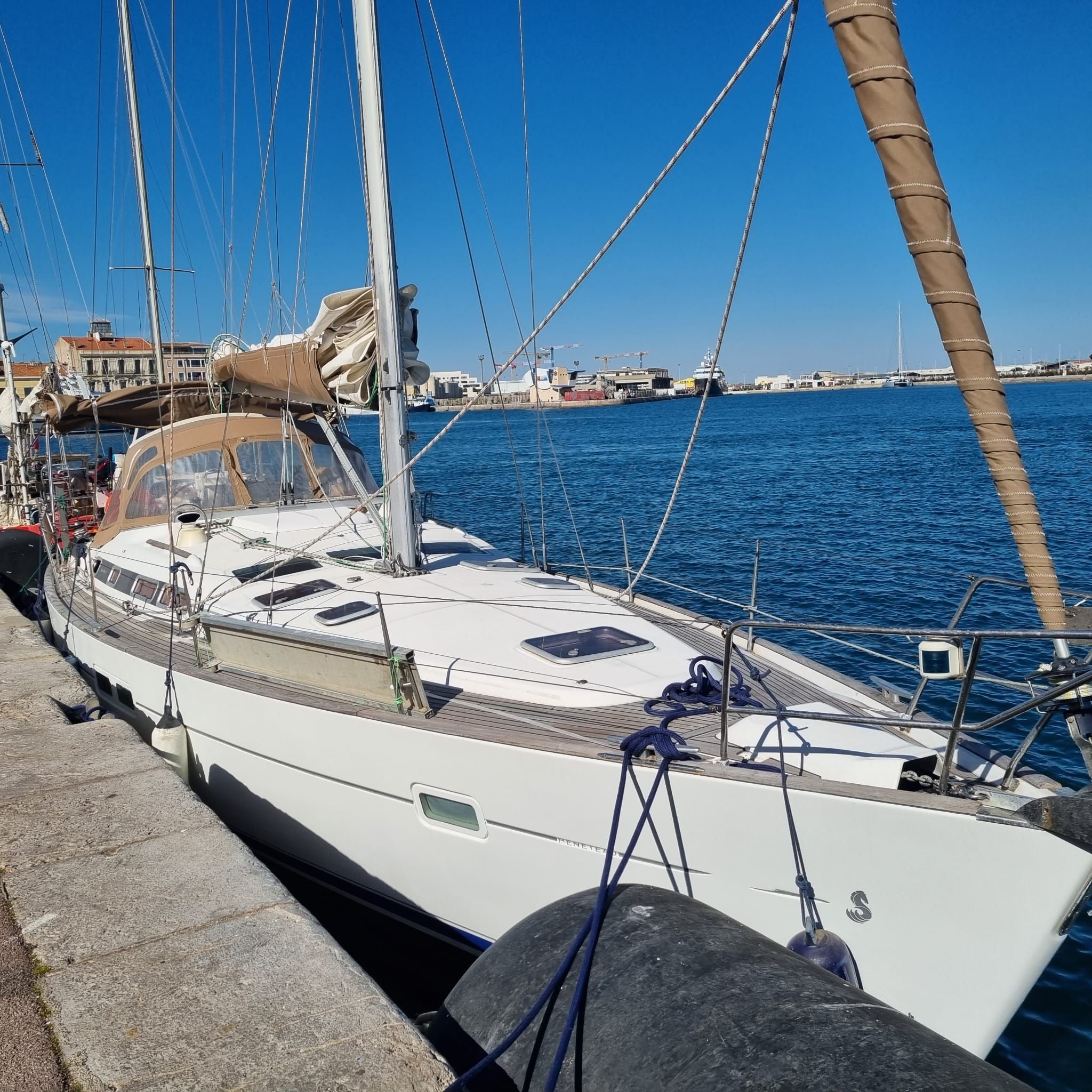 BossoirsCockpit teckPont teckPlateforme de bainEchelle de bainDouchette de cockpitTable de cockpitEclairage de cockpitCoussins de cockpitBimini topPropulseur d'étraveAncreGuindeau électriquePompe de caleCoupe-orinsArmement HAUTURIERAntifouling