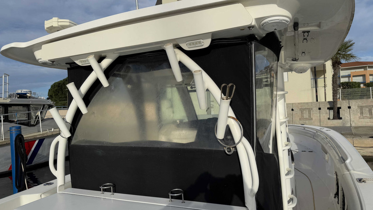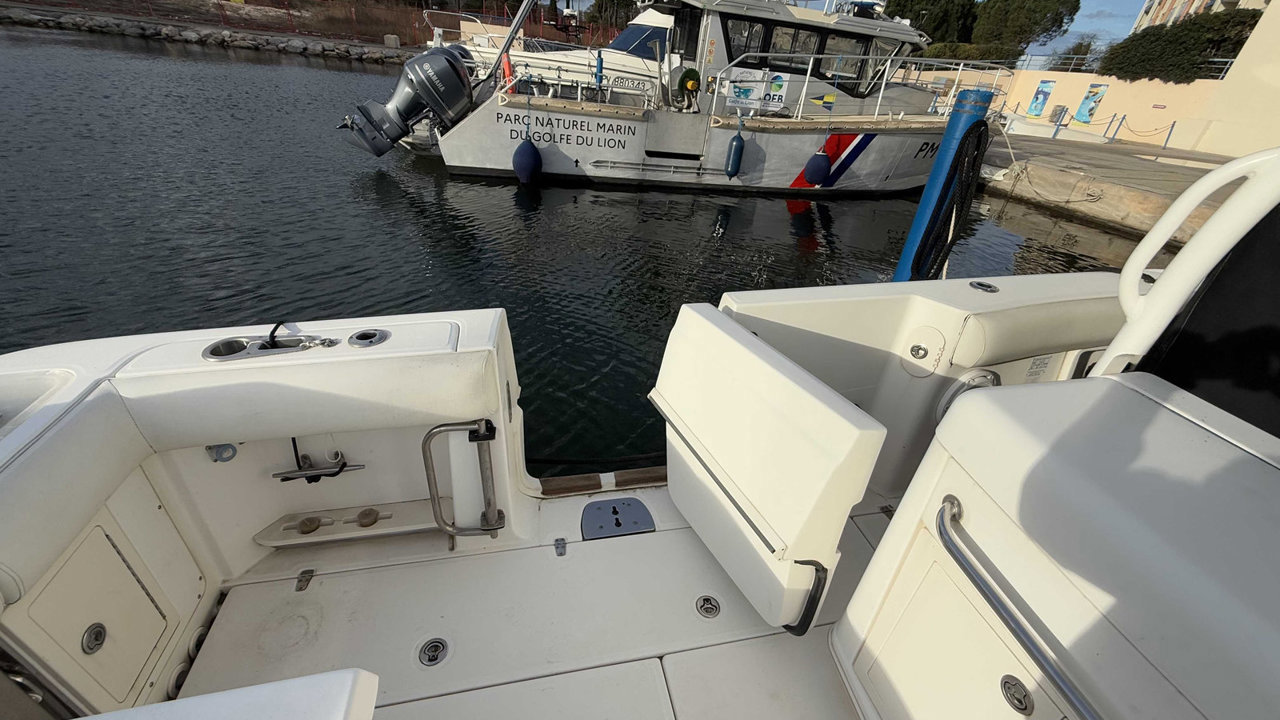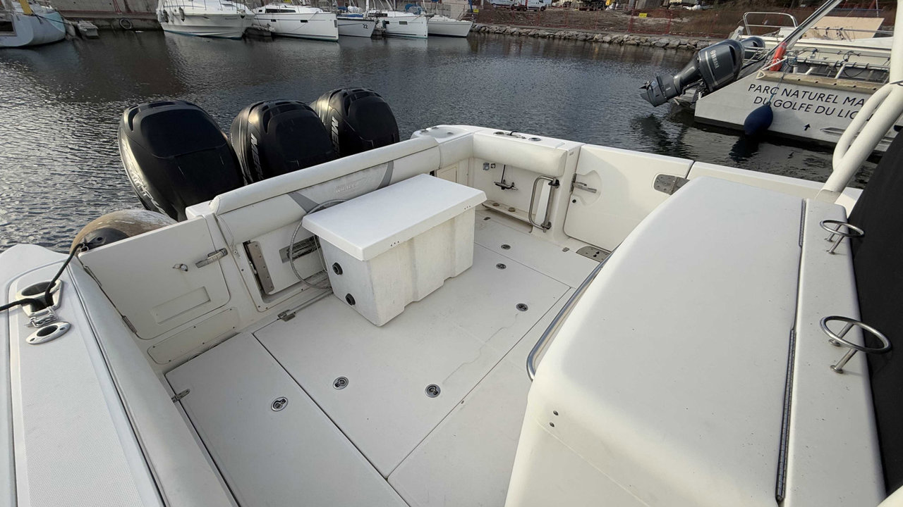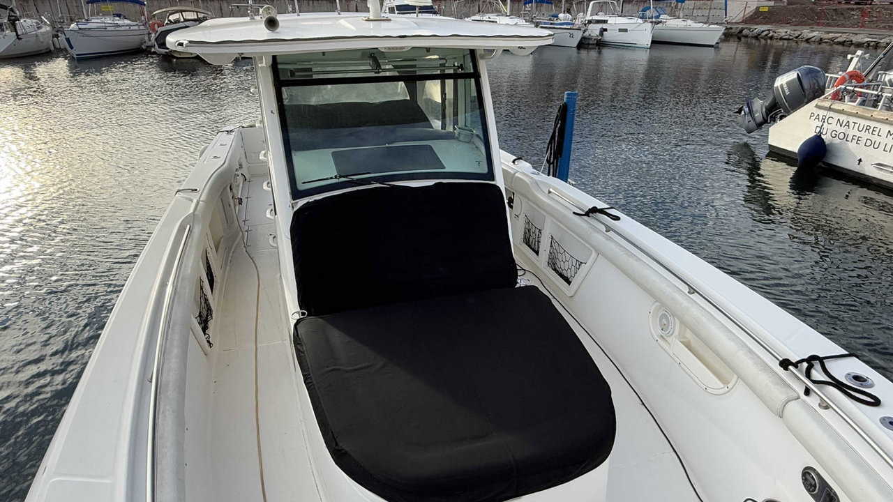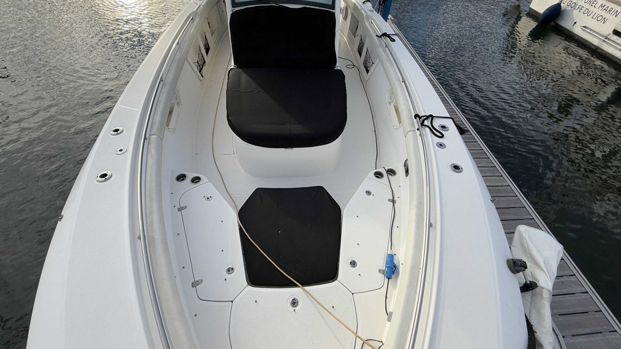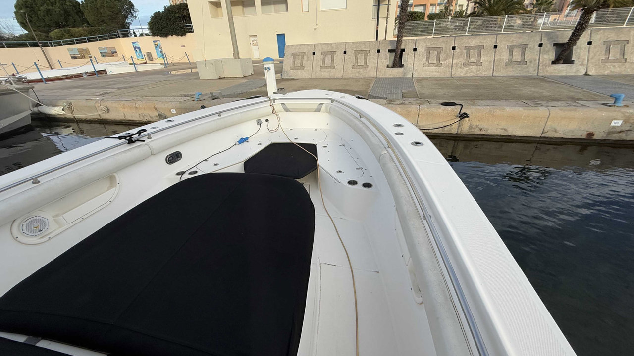 Avec ses 11,40 mètres de long et sa proue pointue comme le nez d’une fusée, le 370 Outrage est plutôt du genre imposant. Outre sa ligne tendue, ce bateau propose également un espace généreux, un haut franc-bord et un T-Top lui aussi impressionnant. A l’intérieur, si la thématique est globalement axée vers la pêche, le confort et l’aspect familial n’a pas été oublié avec notamment un petit carré avant, un solarium ou encore pas mal de places assises sur l’arrière. Comble du luxe pour un open, le Boston Whaler offre un vrai couchage double et même un lavabo ! Côté carène, on frise une fois encore l’excellence avec un bateau incisif, puissant dans la vague et très sécurisant.Marque Boston Whaler