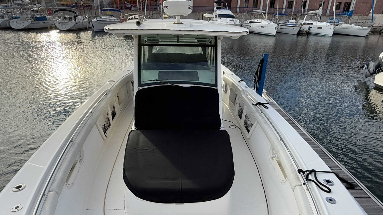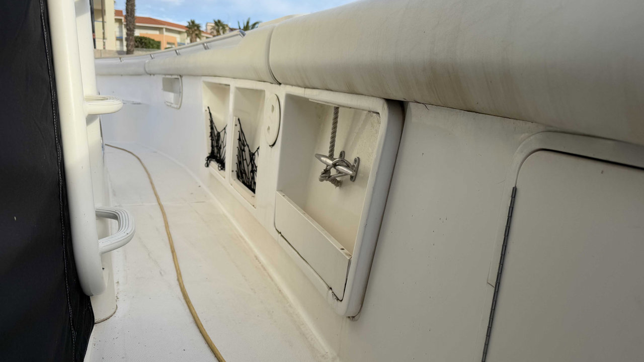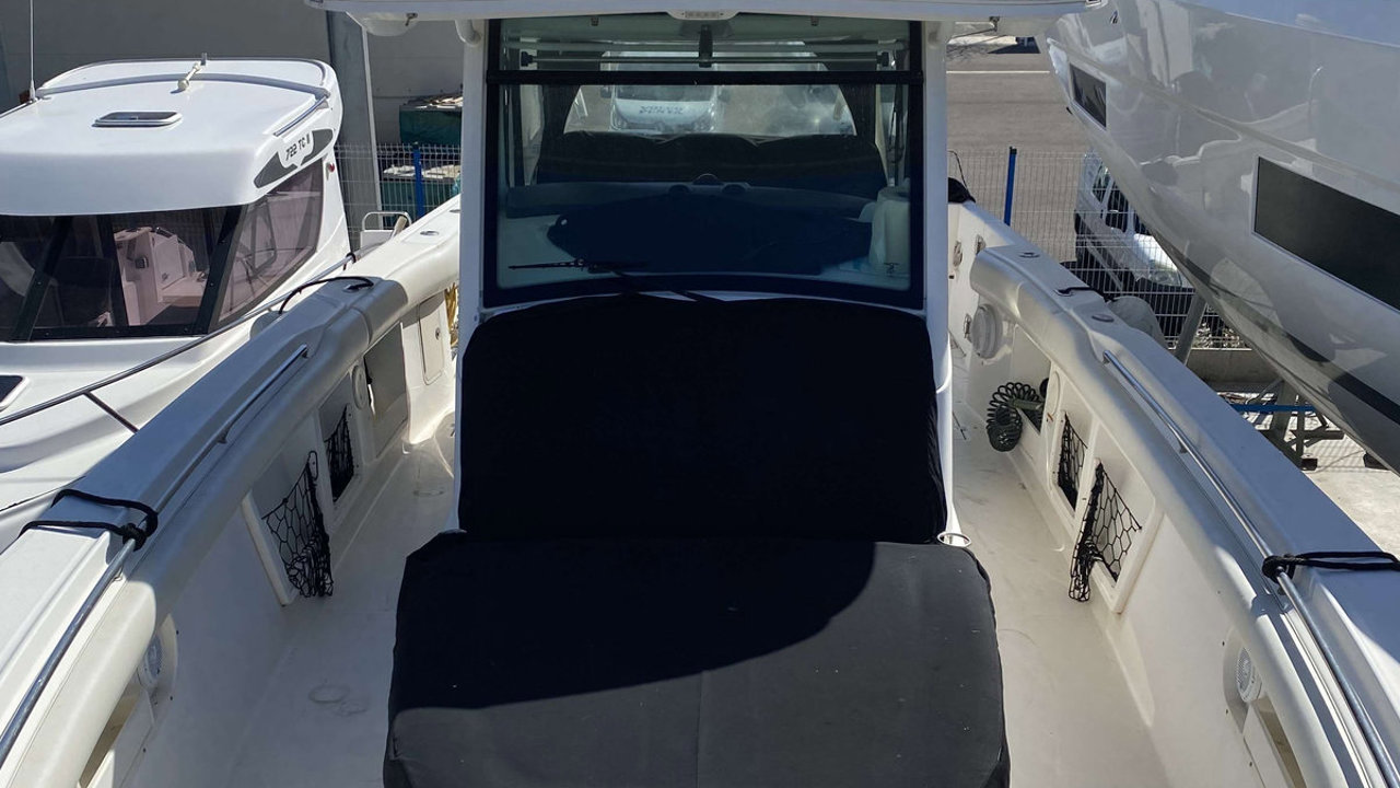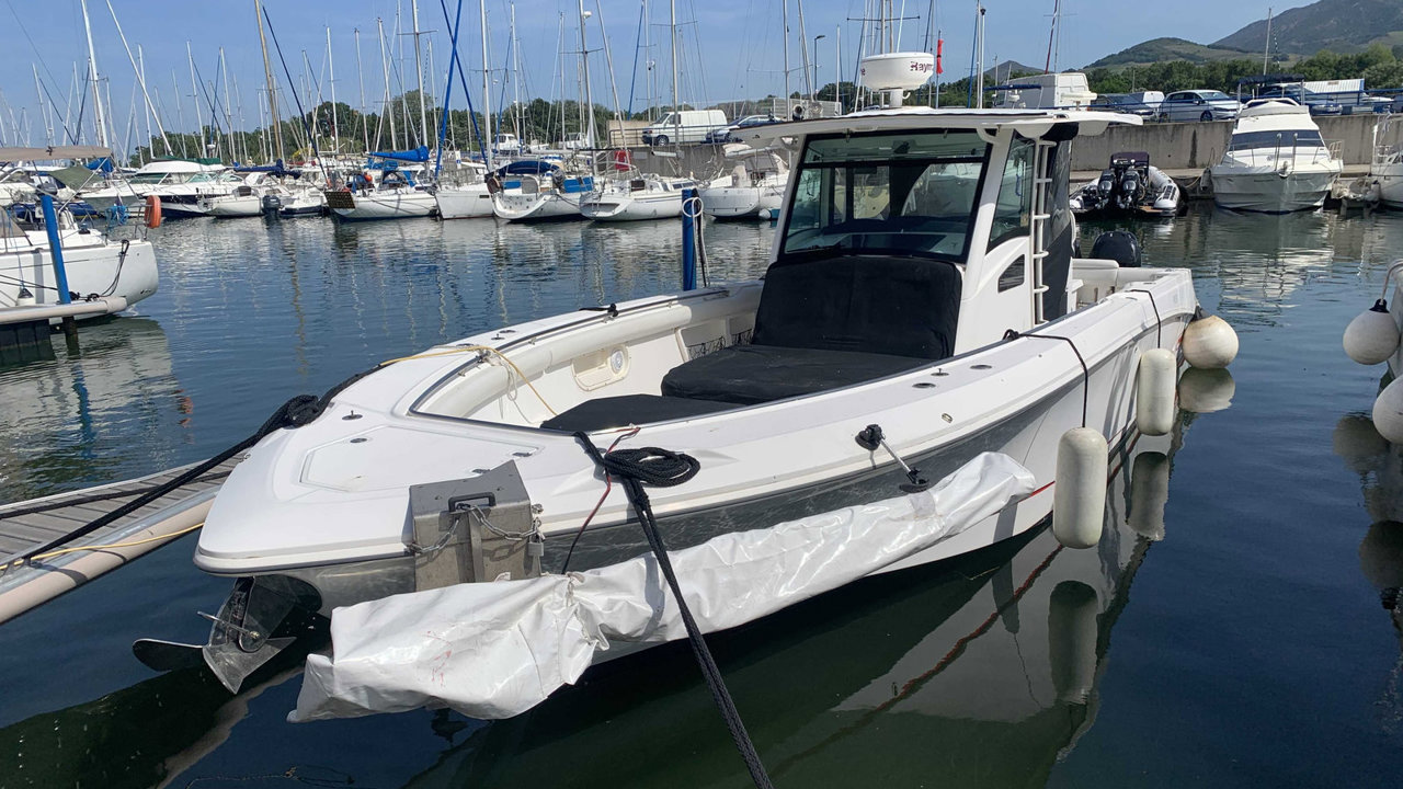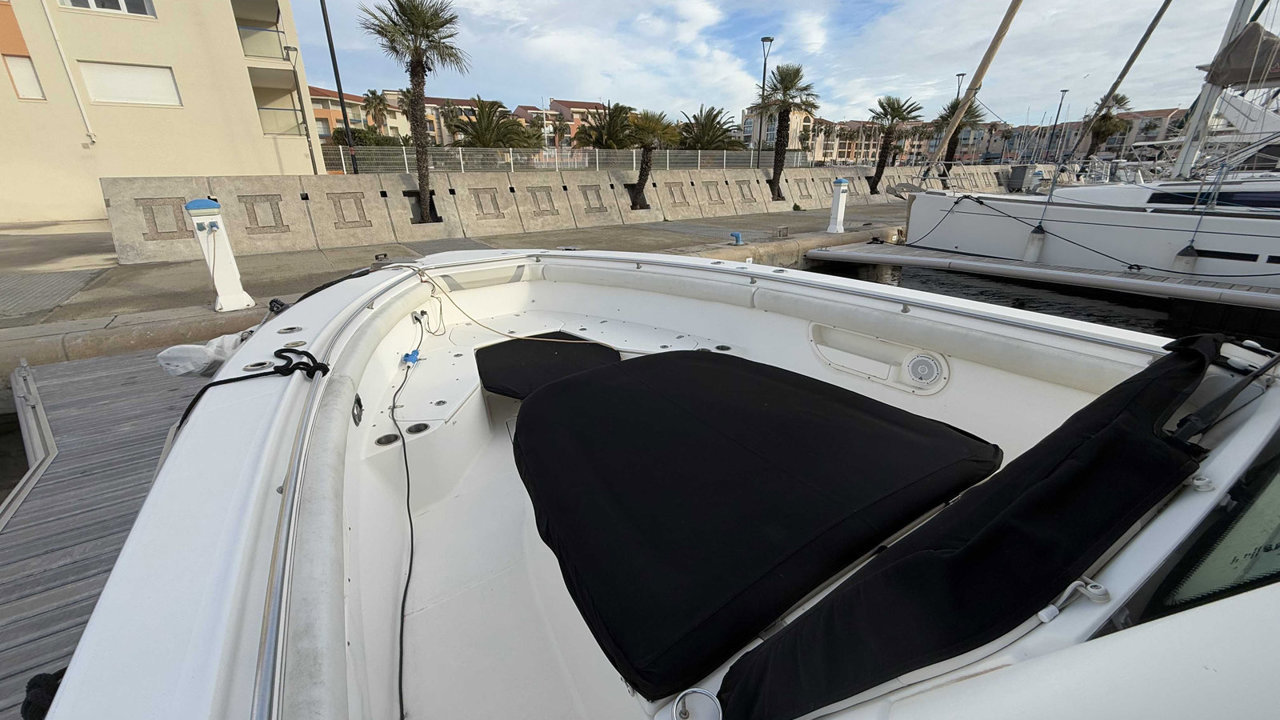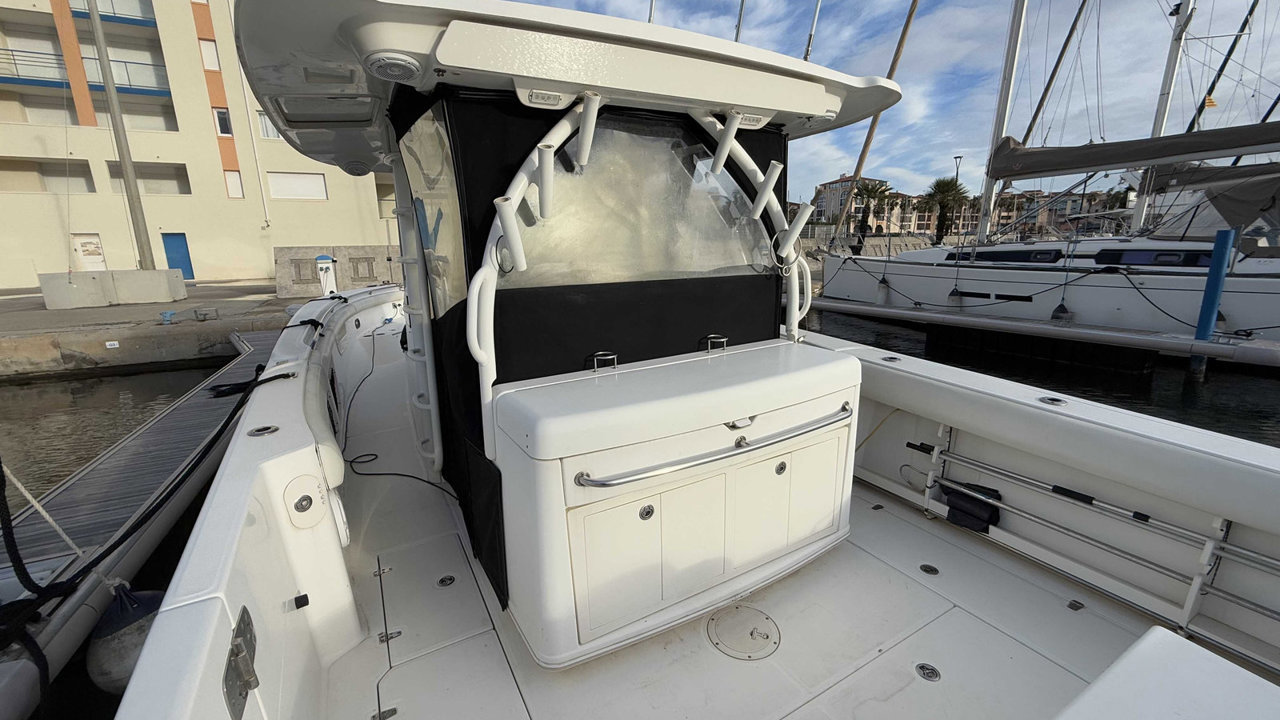 Avec ses 11,40 mètres de long et sa proue pointue comme le nez d’une fusée, le 370 Outrage est plutôt du genre imposant. Outre sa ligne tendue, ce bateau propose également un espace généreux, un haut franc-bord et un T-Top lui aussi impressionnant. A l’intérieur, si la thématique est globalement axée vers la pêche, le confort et l’aspect familial n’a pas été oublié avec notamment un petit carré avant, un solarium ou encore pas mal de places assises sur l’arrière. Comble du luxe pour un open, le Boston Whaler offre un vrai couchage double et même un lavabo ! Côté carène, on frise une fois encore l’excellence avec un bateau incisif, puissant dans la vague et très sécurisant.Marque Boston Whaler