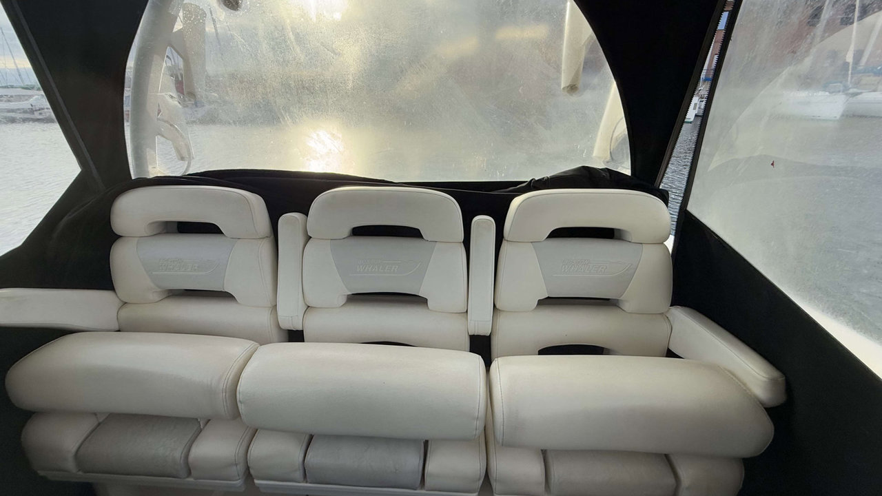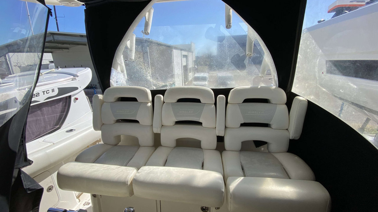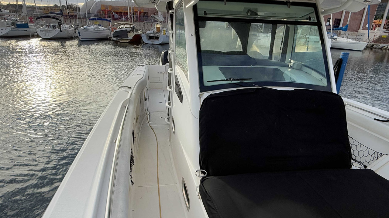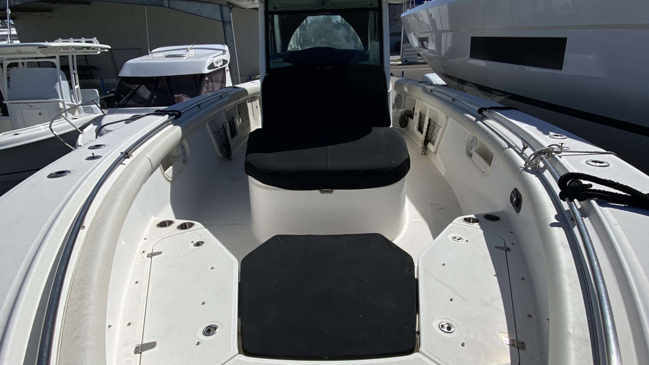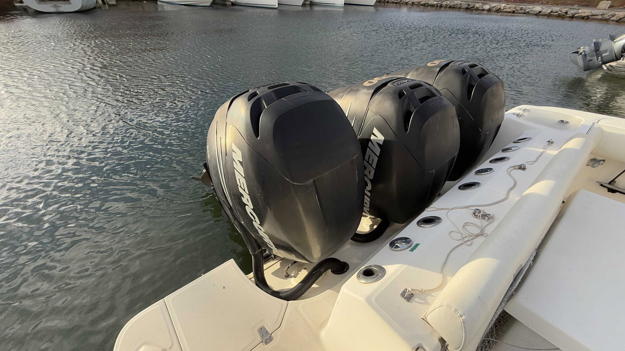 Avec ses 11,40 mètres de long et sa proue pointue comme le nez d’une fusée, le 370 Outrage est plutôt du genre imposant. Outre sa ligne tendue, ce bateau propose également un espace généreux, un haut franc-bord et un T-Top lui aussi impressionnant. A l’intérieur, si la thématique est globalement axée vers la pêche, le confort et l’aspect familial n’a pas été oublié avec notamment un petit carré avant, un solarium ou encore pas mal de places assises sur l’arrière. Comble du luxe pour un open, le Boston Whaler offre un vrai couchage double et même un lavabo ! Côté carène, on frise une fois encore l’excellence avec un bateau incisif, puissant dans la vague et très sécurisant.Marque Boston Whaler