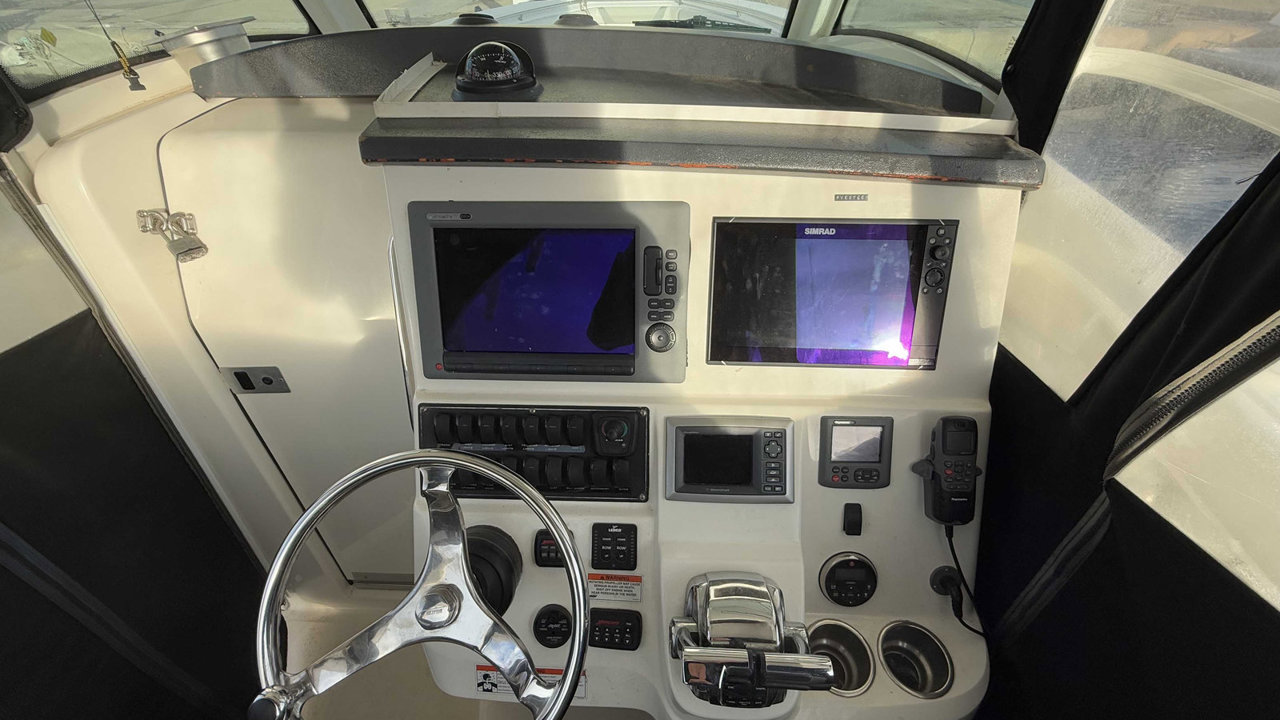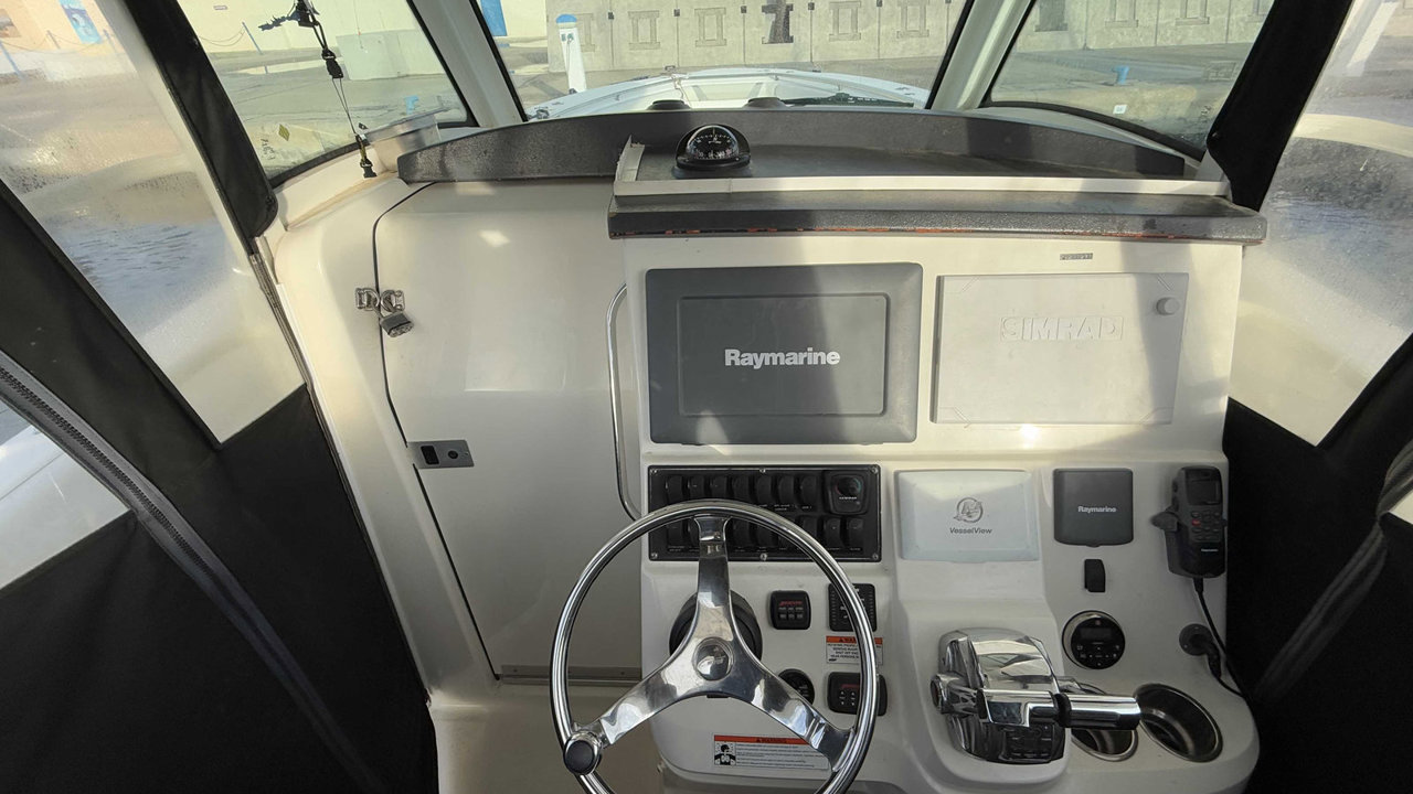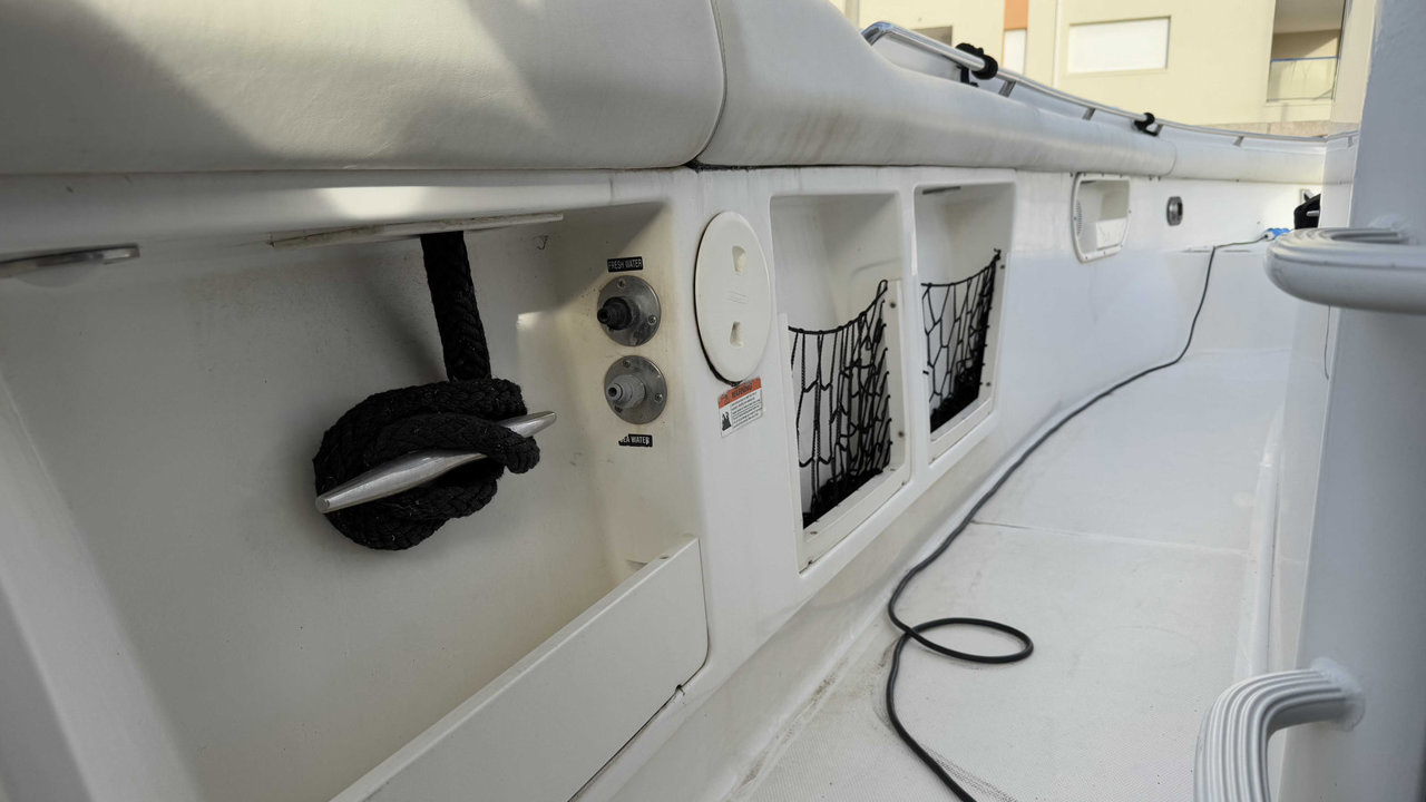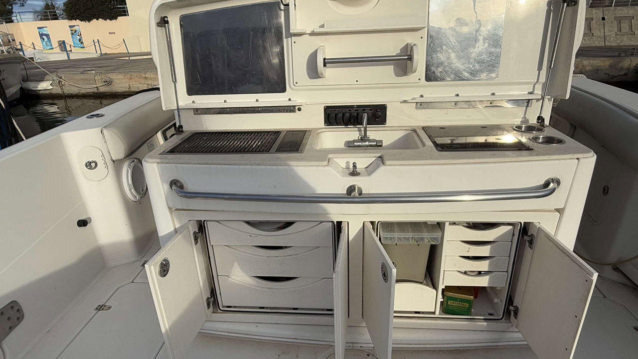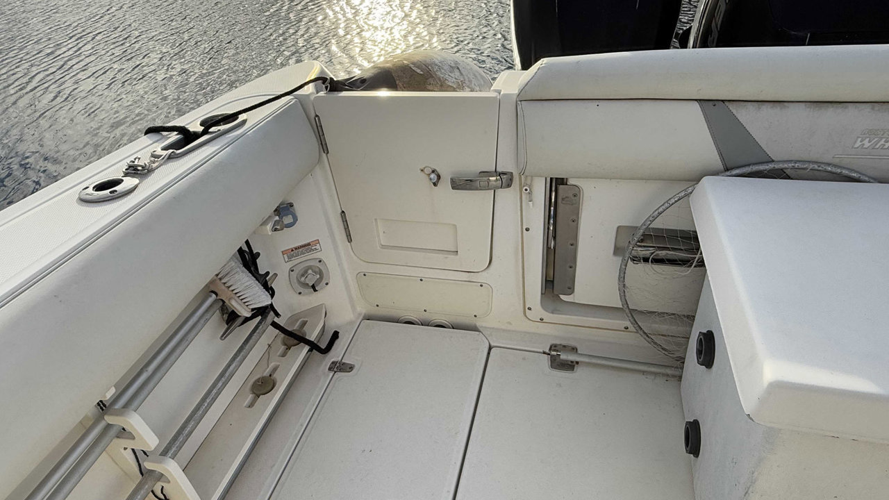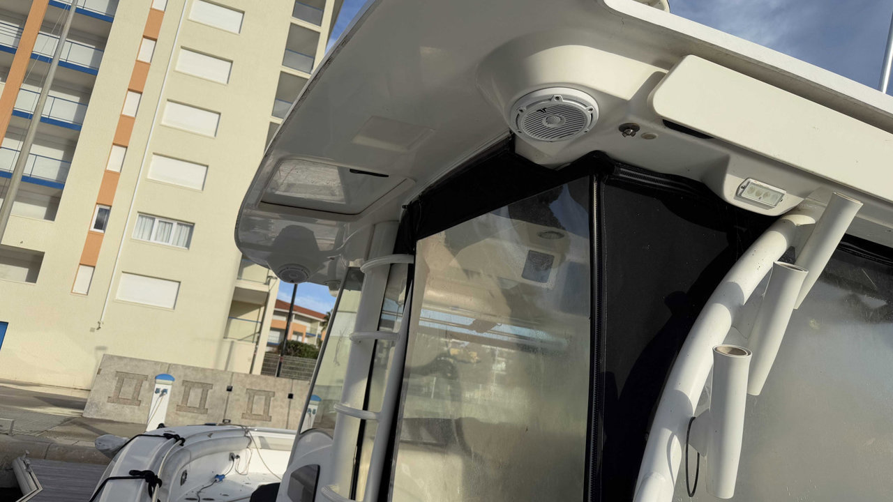 Avec ses 11,40 mètres de long et sa proue pointue comme le nez d’une fusée, le 370 Outrage est plutôt du genre imposant. Outre sa ligne tendue, ce bateau propose également un espace généreux, un haut franc-bord et un T-Top lui aussi impressionnant. A l’intérieur, si la thématique est globalement axée vers la pêche, le confort et l’aspect familial n’a pas été oublié avec notamment un petit carré avant, un solarium ou encore pas mal de places assises sur l’arrière. Comble du luxe pour un open, le Boston Whaler offre un vrai couchage double et même un lavabo ! Côté carène, on frise une fois encore l’excellence avec un bateau incisif, puissant dans la vague et très sécurisant.Marque Boston Whaler