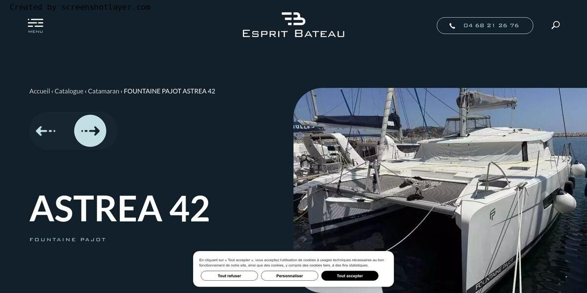 Exceptionnelle opportunité chez Esprit Bateau avec ce magnique ASTREA 42 de 2022 à vendre Nous avons le plaisir de vous proposer à la vente un Fountaine Pajot ASTREA 42, millésime 2022, dans un état irréprochable. Ce catamaran moderne combine à la perfection confort, performance et élégance, et représente l’un des modèles les plus appréciés de la gamme Fountaine Pajot. Points forts de cette unité exceptionnelle : Année 2023 : très peu navigué, proche du neuf Entretien irréprochable, suivi méticuleux Équipements complets haut de gamme : électronique, énergie, confort à bord, sécurité Aménagements spacieux et lumineux, parfaits pour la croisière ou la vie à bord Performances marines reconnues, stabilité et sécurité assurées Idéal pour les navigateurs exigeants ou les projets de grande croisière, ce catamaran est immédiatement disponible et visible sur rendez-vous chez Esprit Bateau. Contactez-nous dès aujourd’hui pour recevoir la fiche détaillée, organiser une visite. Une occasion rare de naviguer rapidement sur une unité prestigieuse. Ne laissez pas passer cette opportunité unique ! PLACE DE PORT DISPONIBLE FINANCEMENT POSSIBLEMarque Fountaine Pajot