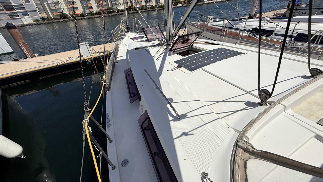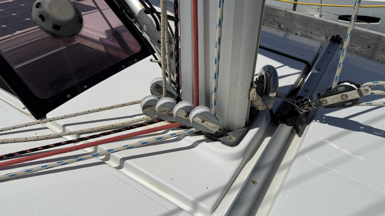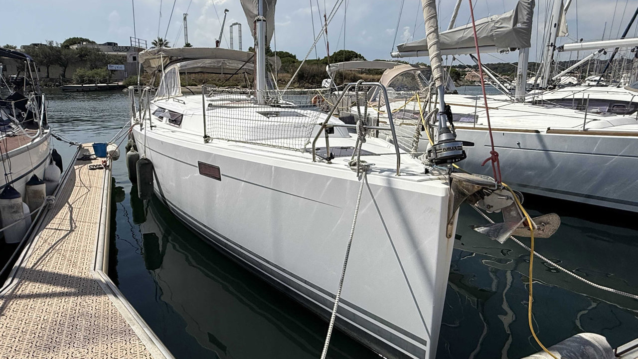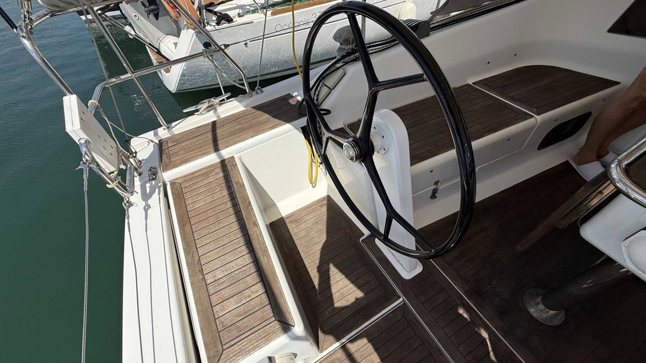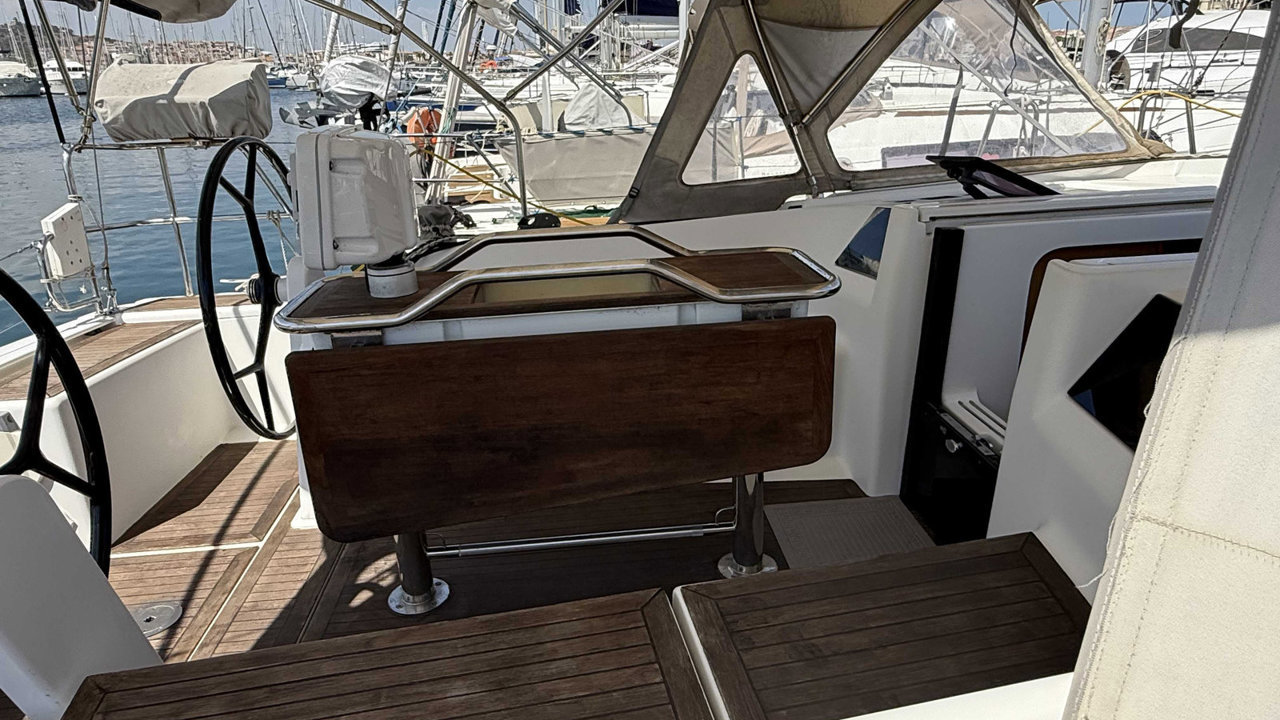 propulseur d'étravebiminicapote descenteplateforme de bainéchelle de baindouchette cockpittable cockpitéclairage cockpitbarre à roueancreguindeau électriquegennakergrand voilegrand voile semi lattéechariot grand voilerail grand voilerenvoi de drissewinchmanivelle de winchbout dehorslazy baglazy jackcapacité eau froidepompe de calecouleurmatérieau constructionantifoulingbarbecueheures bateauannexemoteur annexetable à cartesréfrigérateurcuisinièrefourchauffe-eauradio-cdWC marinspilote autocompasloch speedogirouetteantenneVHFGPSsondeurréflecteur radarchargeuralternateurbatteriesbatteries de servicecircuit 220Vcircuit 12Vpanneau solaireprise de quai