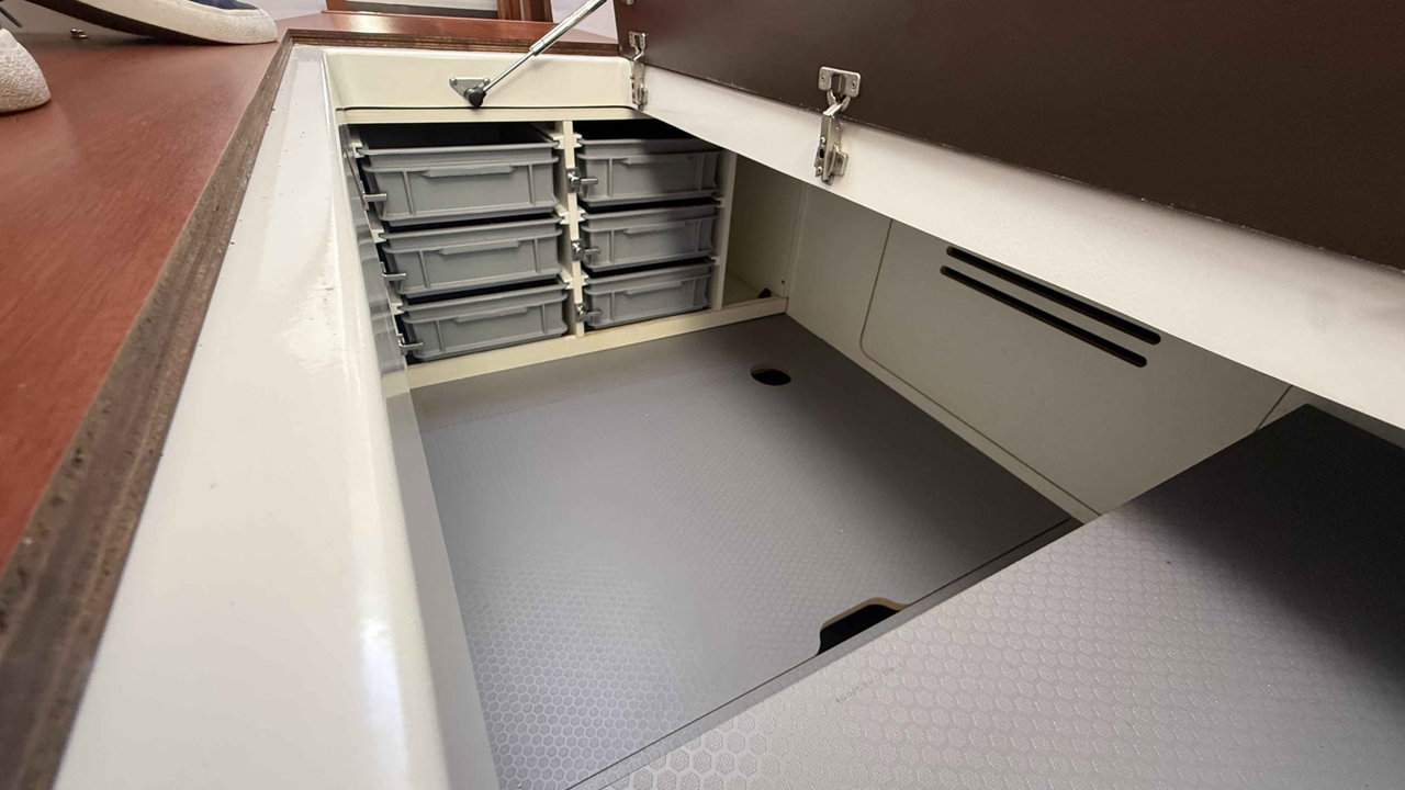 Caratéristiques principales : - Moteur: Volvo Penta D4-260DP de 264 heures - Carburant: Diesel - Capacité carburant: 300 L - Capacité eau douce: 160 L - Poids: 4 830 kg - Couleur: Gris