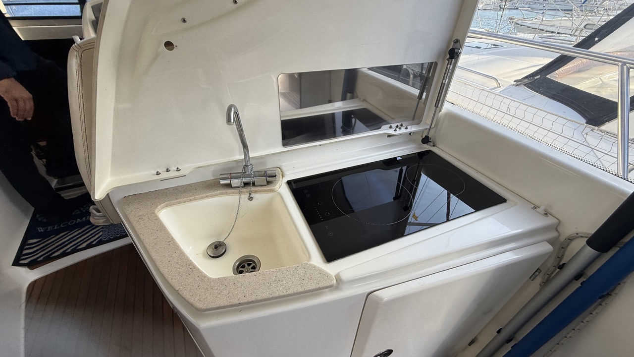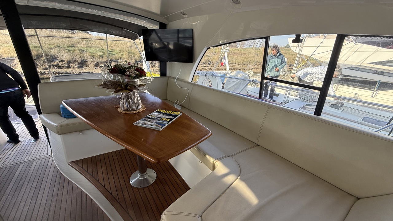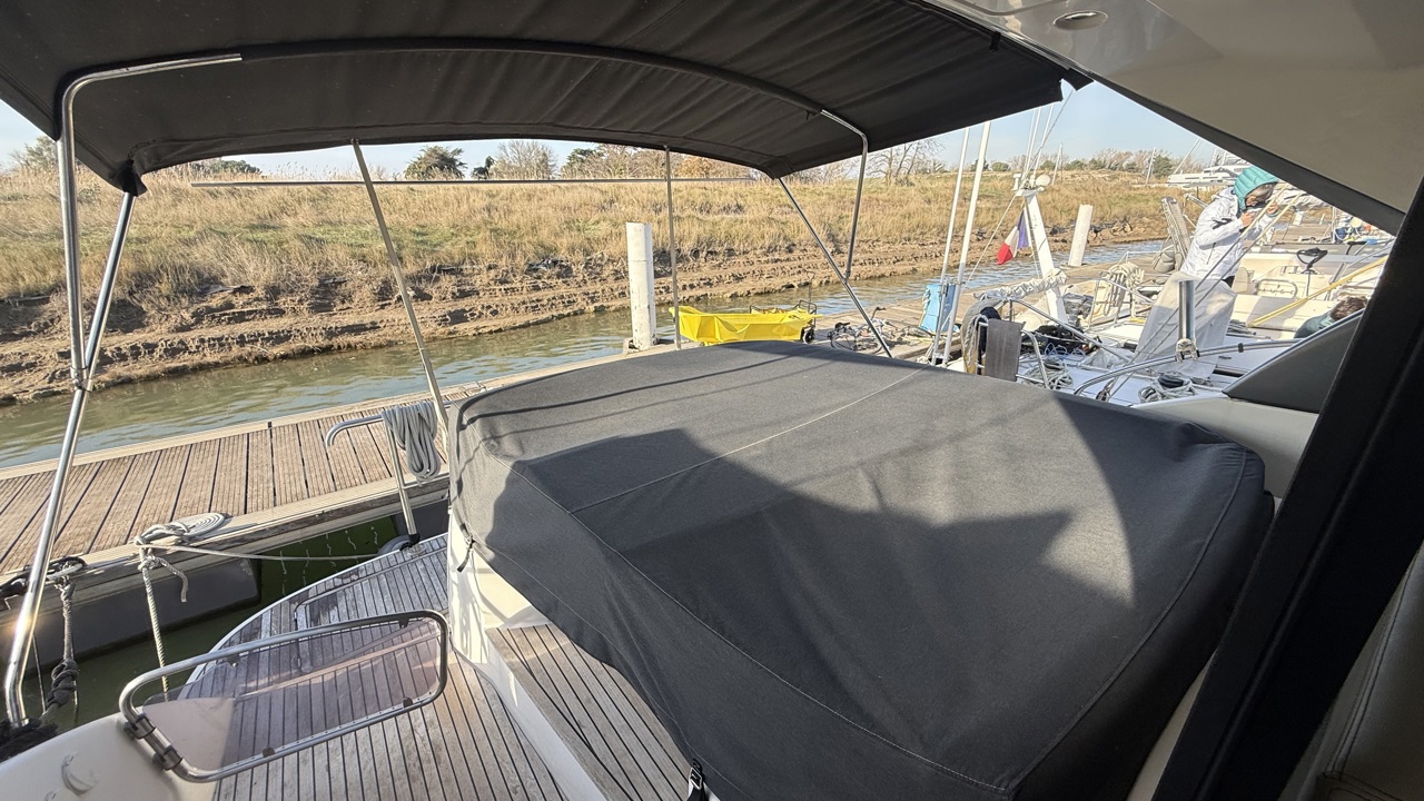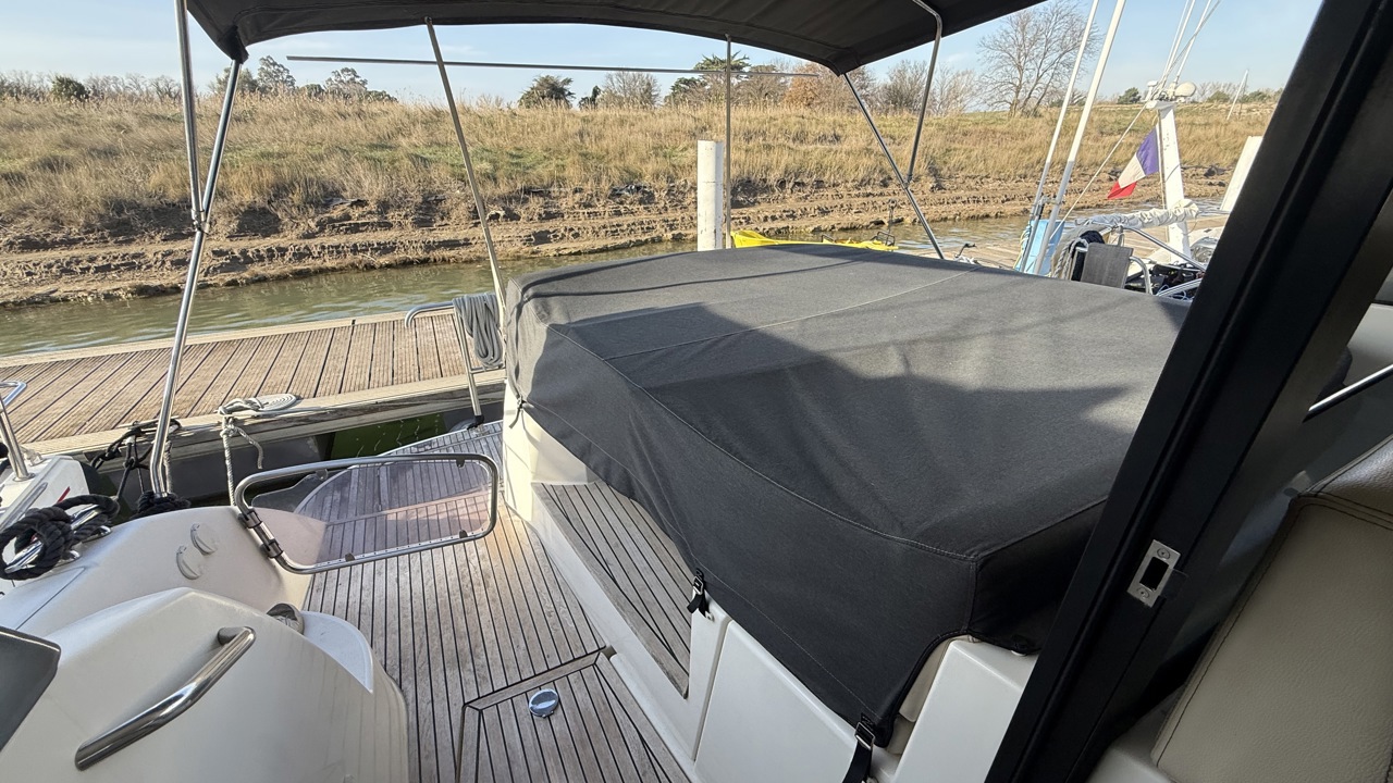 cockpit teckcoussin cockpitdouchette cockpitéclairage cockpittable cockpitbain de soleil arrièrebain de soleil avantbarbecuebiminiéchelle de bainflapsplateforme de baintaud de soleiltaud campingancreguindeau électriquemoteur annexesondeur pêche