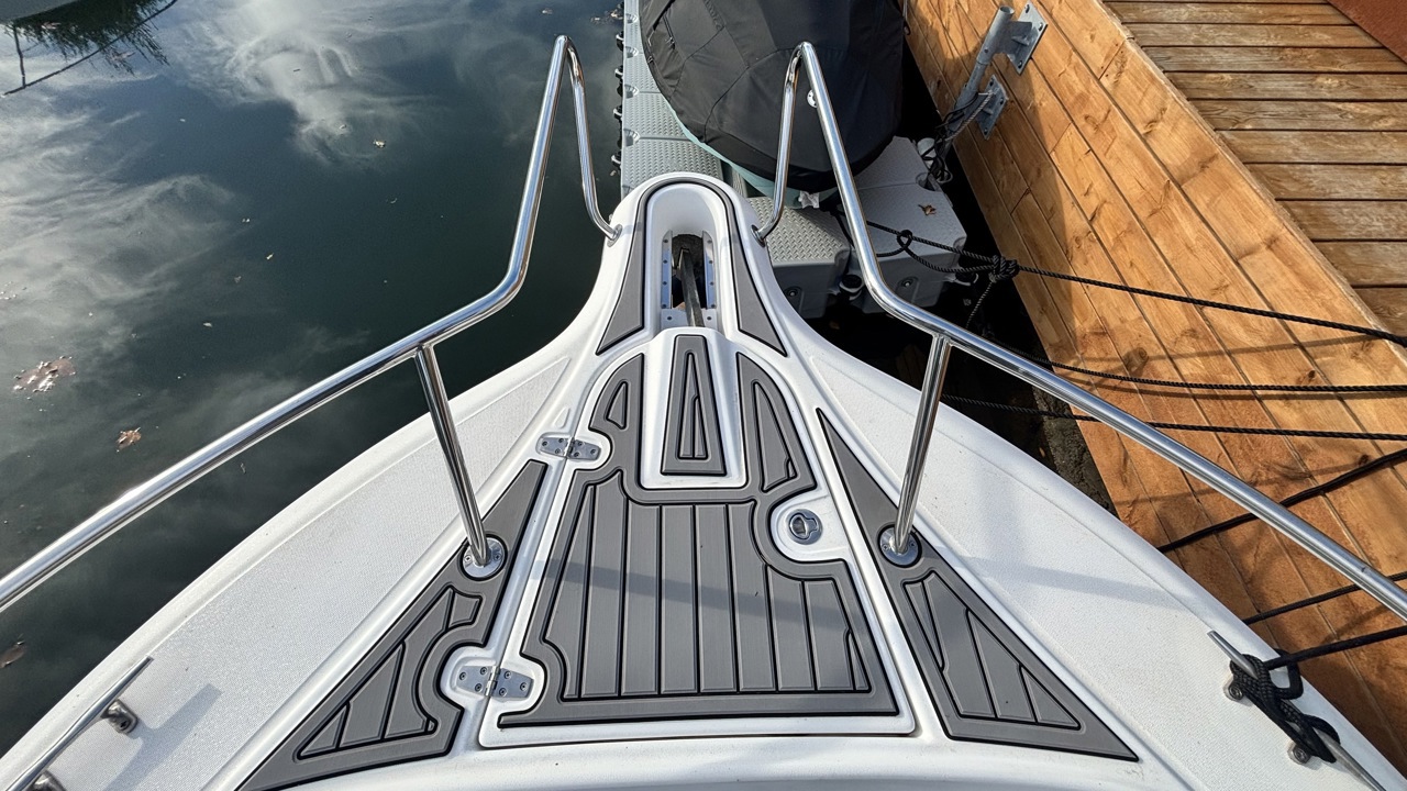 cockpit teck synthétique Grisdouchette cockpittable cockpitcoussin cockpitéclairage cockpit (sonos)T-Toptaud de soleil avantéchelle de bainbain de soleil avantancreguindeau électriquepeinture de coque Bleu / Covering Grisportes cannes