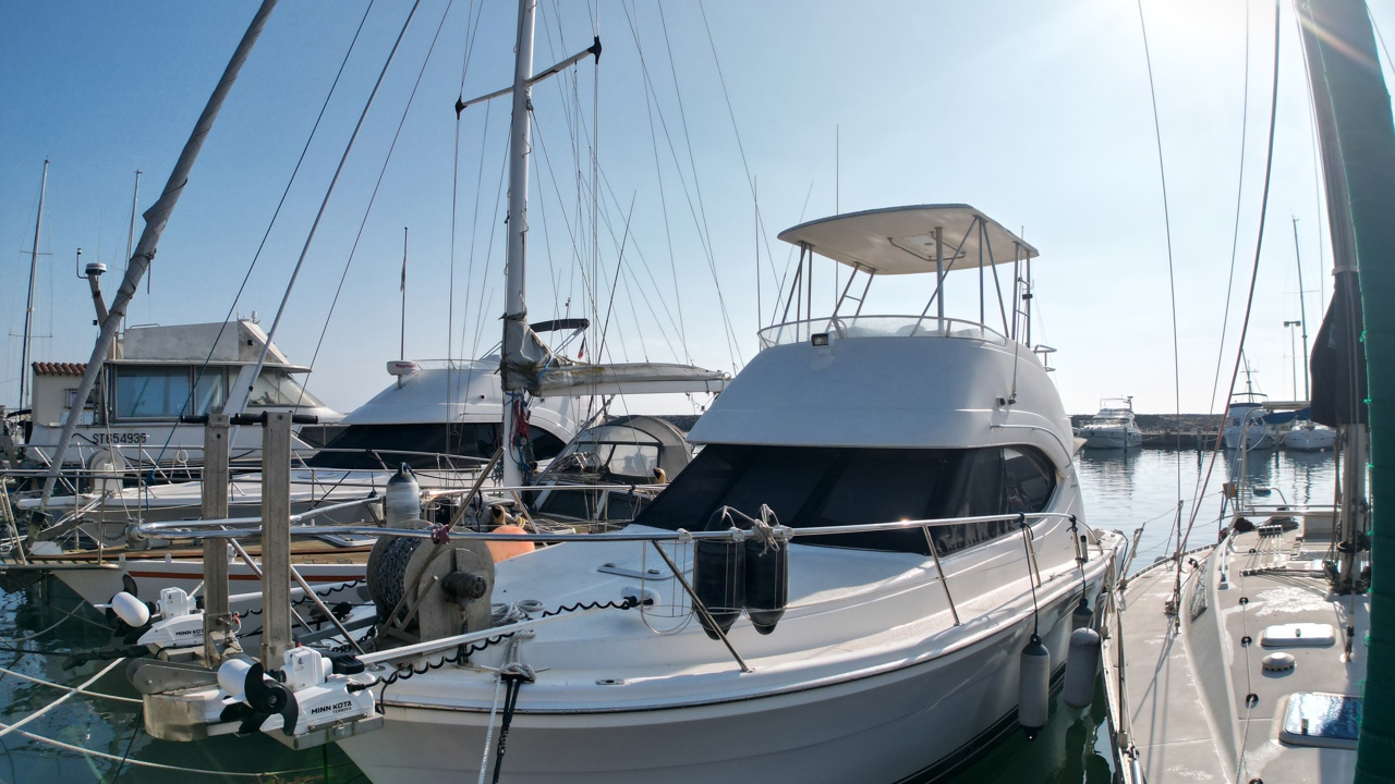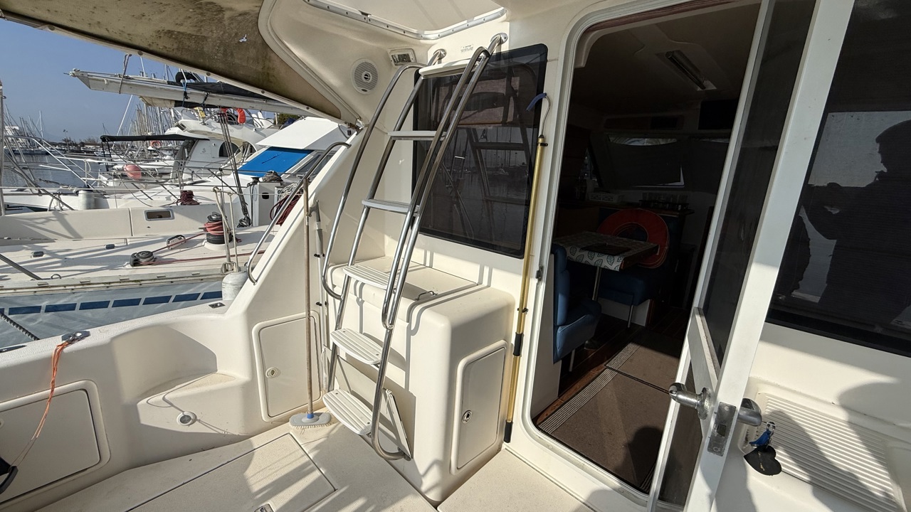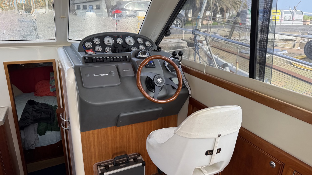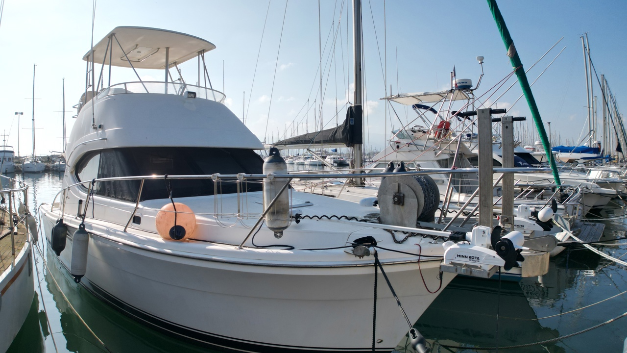 Riviera 33 Fly – Yacht Flybridge Diesel – Croisière & Plaisance Le bateau sera vendu sans les Minn Kota / ni le treuil avant (le guindeau d'origine sera remis en place et la chaise de combat à l'arriére sera retirée aussi! Découvrez le Riviera 33 Fly, un yacht flybridge diesel reconnu pour sa robustesse, son confort et ses performances en mer. Construit par le chantier australien Riviera, ce modèle est une référence sur le marché du bateau à moteur d’occasion pour la croisière côtière et hauturière. Avec une longueur d’environ 11 mètres et une largeur généreuse, le Riviera 33 Fly offre un espace de vie optimisé, idéal pour les sorties en famille ou entre amis. Son flybridge spacieux permet une visibilité exceptionnelle et une navigation confortable, tandis que le cockpit arrière est parfaitement adapté aux moments de détente ou aux activités nautiques. Motorisé en double diesel inboard volvo 310cv, ce yacht assure puissance, fiabilité et autonomie pour naviguer en toute sérénité. Sa carène performante garantit une excellente tenue en mer, même par conditions formées. À l’intérieur, le Riviera 33 Fly propose un aménagement chaleureux avec cabine, carré lumineux, cuisine équipée et salle d’eau, offrant un véritable confort pour les croisières prolongées. Très recherché sur le marché du yacht flybridge d’occasion, le Riviera 33 Fly séduit par sa qualité de construction, sa valeur sûre et son excellent rapport confort/performance. Place de port possible bateau suivi par professionnel (entretien à jour)Marque Riviera