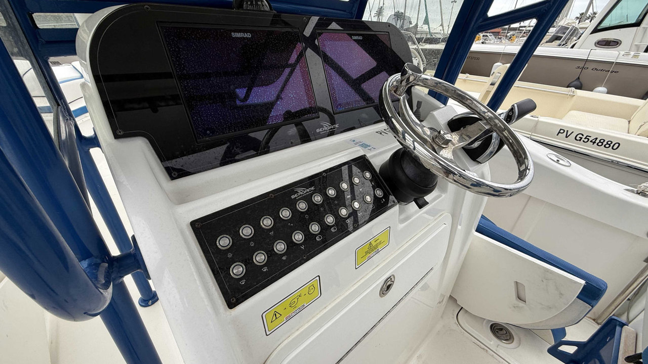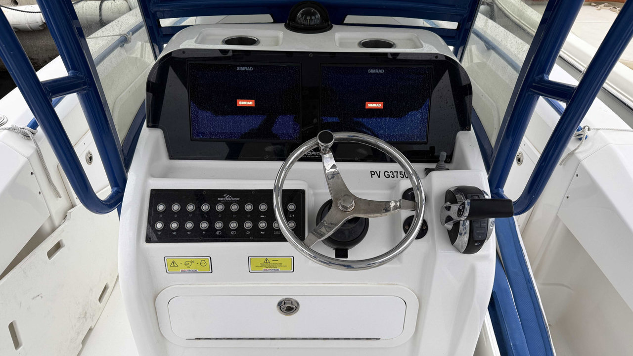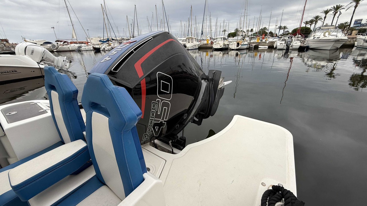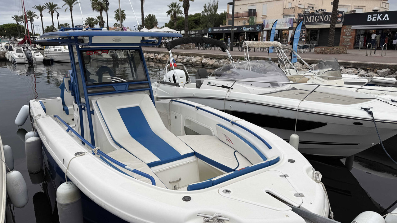 Seagame 250 CC de 2022, équipé d'un puissant moteur Mercury-Racing 450 cv affichant seulement 243 heures. Ce modèle est réputé pour sa polyvalence, sa stabilité en mer et ses performances sportives, idéales aussi bine pour la pêche que pour la promenade.