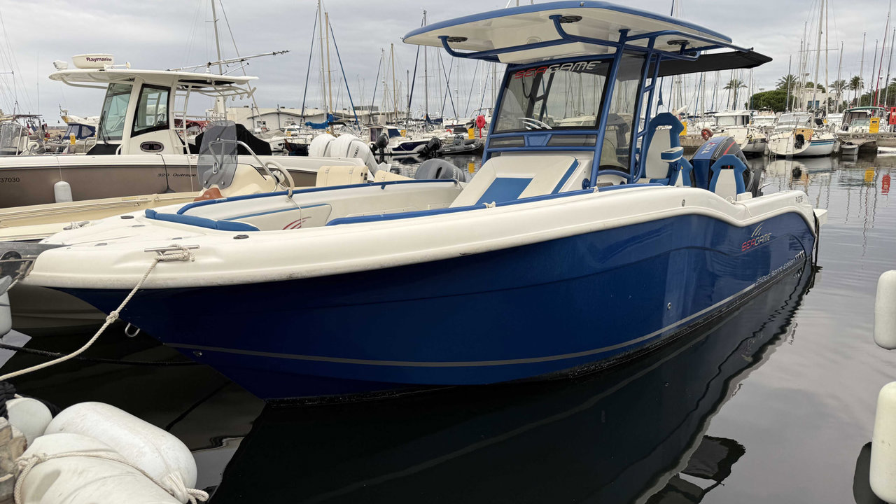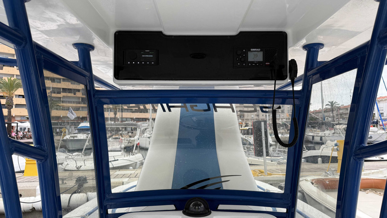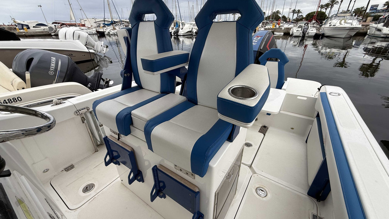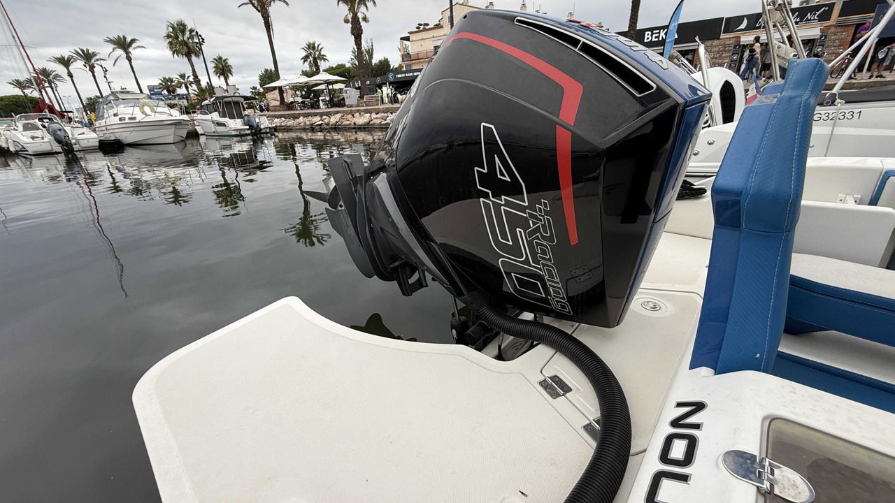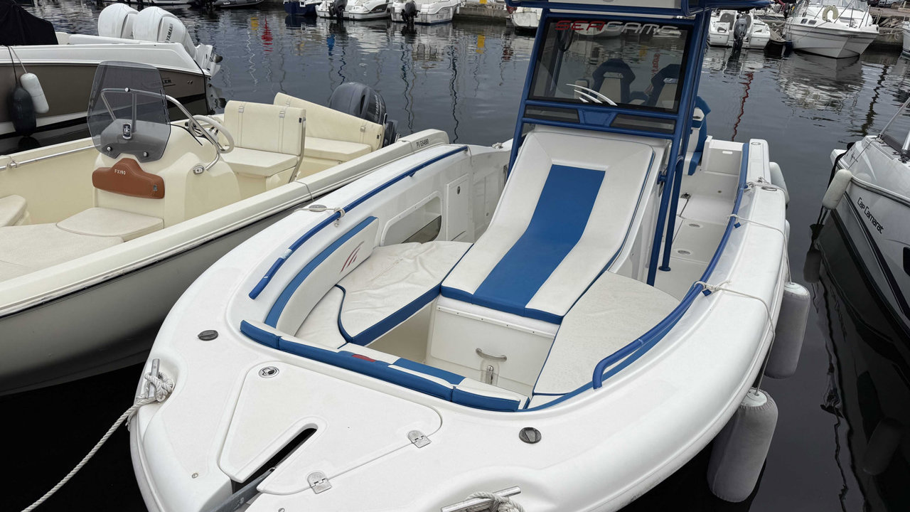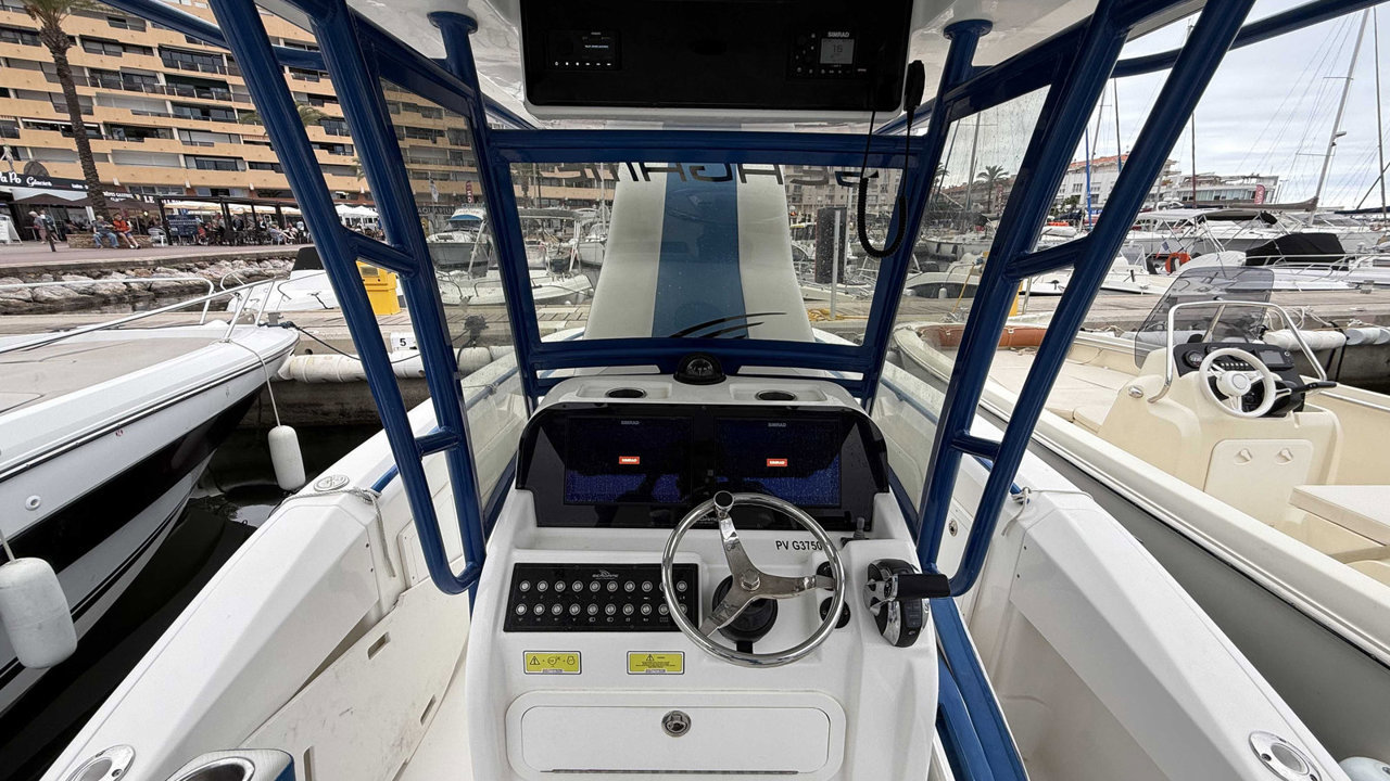 Avec ses 7,54 m de longueur et 2,54 m de largeur, ce bateau open de type console centrale offre un grand confort de navigation. On retrouve un T-Top rigide, un bain de soleil avant, une banquete arrière repliable, ainsi qu'un cockpit spacieux et fonctionnel. Coté équipement, il dispose d'un GPS sondeur Garmin, d'une VHF, D'un Guindeau électrique, d'un vivier à poissons, ainsi que d'une douchette de pont et nombreux rangements.